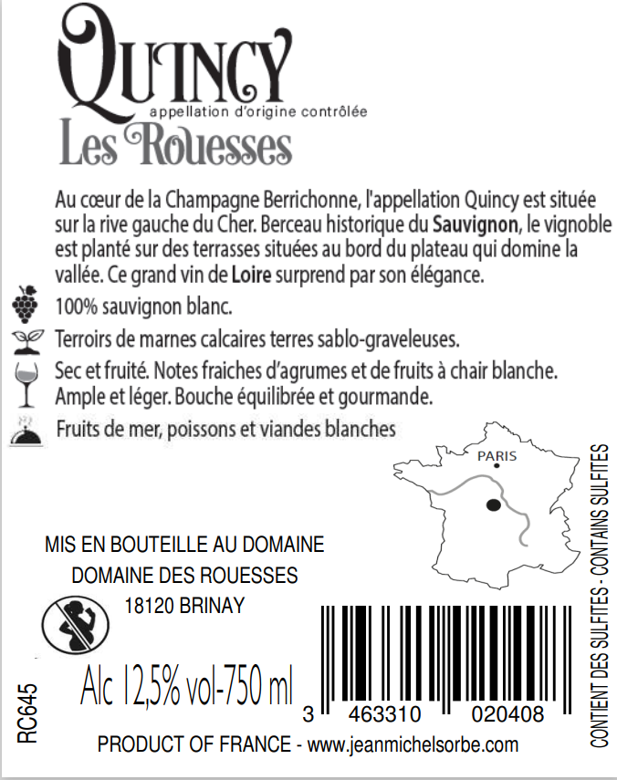 Libellé Joseph Mellot Quincy Les Rouesses, 2023 - Quincy AOP - Blanc Sec - 75 cl