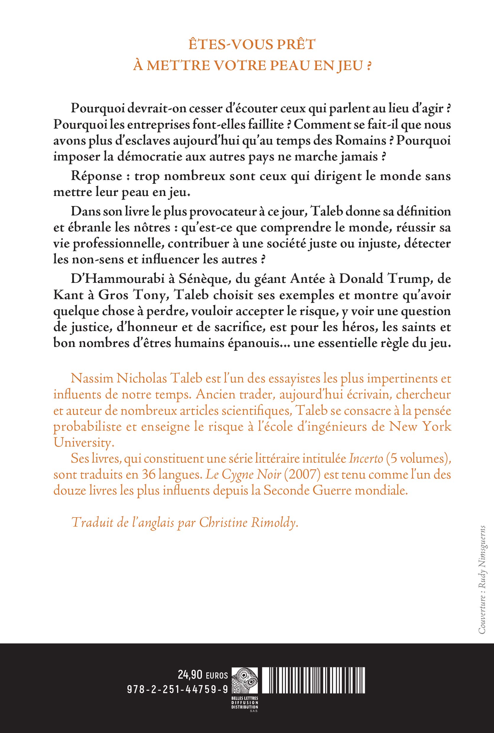 D'Hammourabi à Sénèque, du géant Antée à Donald Trump, de Kant à Gros Tony, Taleb choisit ses exemples et montre qu'avoir quelque chose à perdre, vouloir accepter le risque, y voir une question de justice, d'honneur et de sacrifice, est pour les héros, les saints et bon nombres d'êtres humains épanouis+++ une essentielle règle du jeu.