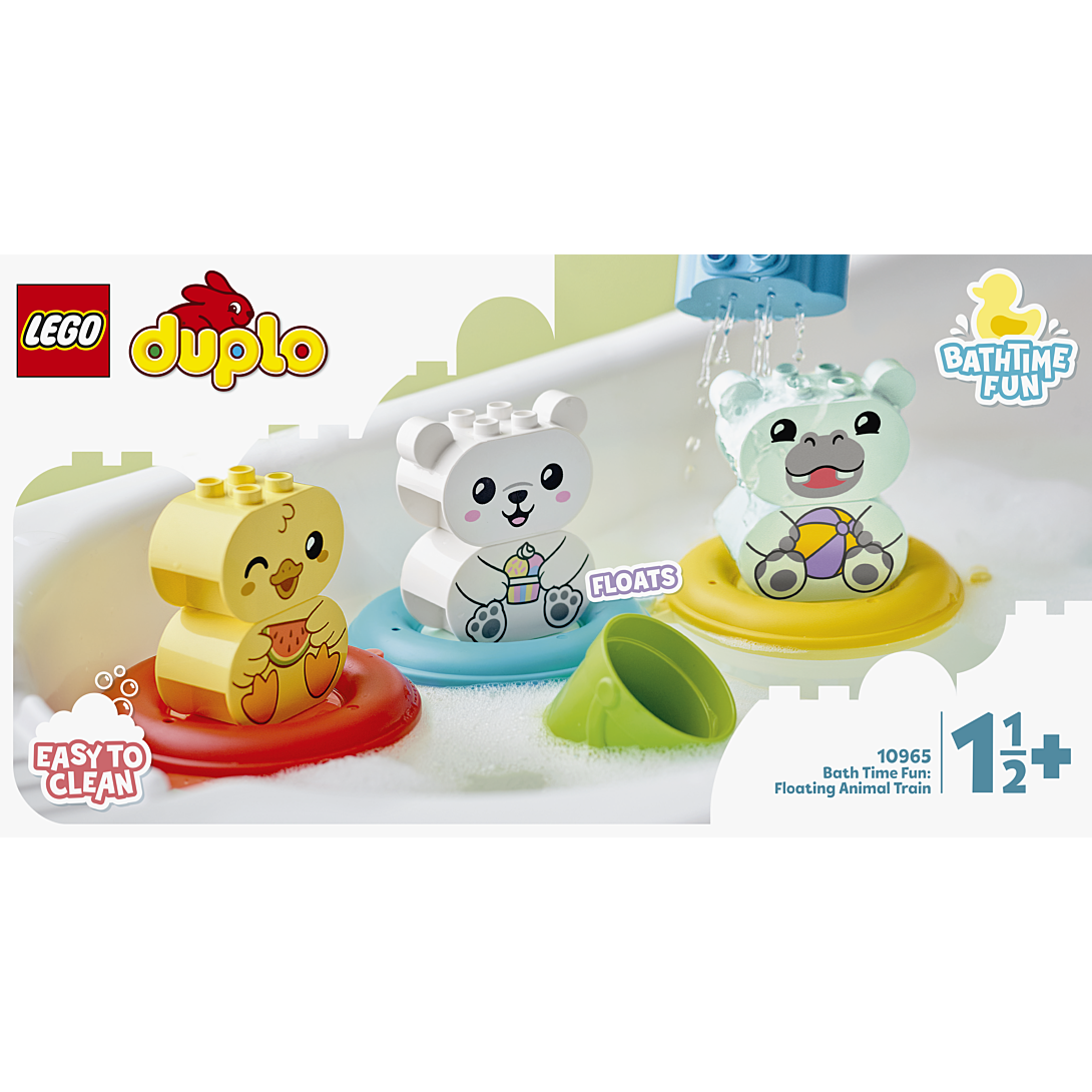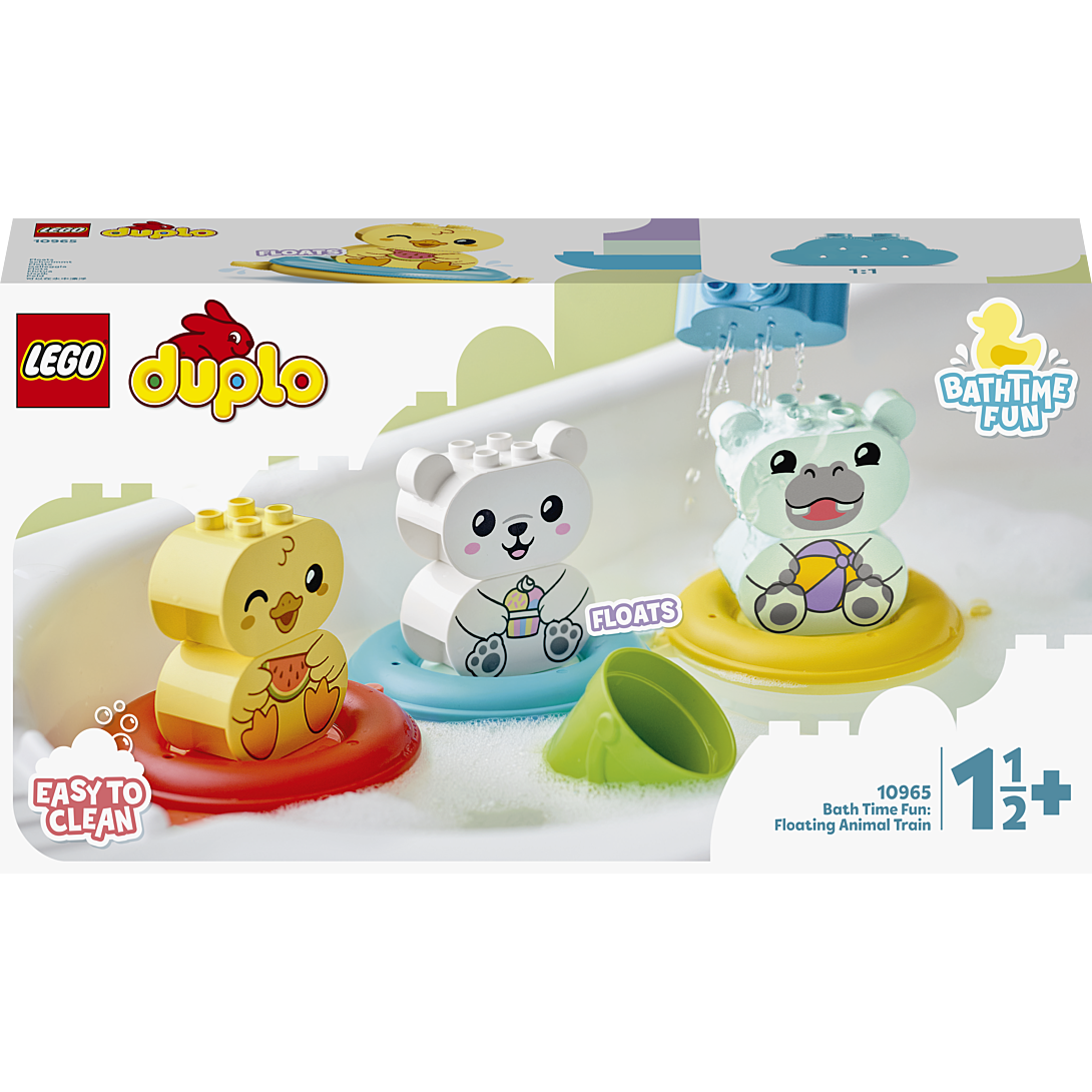 Le jouet pour bébés et enfants de 1.5+ ans LEGO DUPLO My First Jouet de bain : Le train flottant des animaux (10965) est un jouet pour la baignoire pour les enfants facile à nettoyer qui offre une expérience de développement ludique. Il rendra l’heure du bain encore plus amusante avec son hippopotame, son canard de bain et son ours polaire. Les 3 jouets de figurines d’animaux LEGO DUPLO sont placées sur différents anneaux flottants à attacher. Il y a un seau pour laver les animaux et un nuage pour faire de la pluie. Les crochets ronds placés sur les anneaux flottants permettent aux enfants de connecter cet ensemble à d’autres sets LEGO Jouet de bain. De plus, les anneaux peuvent s’ouvrir pour être bien rincés et rester propres bain après bain. Les parents peuvent partager les précieuses étapes du développement de leurs enfants grâce aux jouets LEGO DUPLO, qui placent l’amusement, l’expression de soi et l’exploration ludique entre les mains des tout-petits. Le célèbre train des animaux LEGO DUPLO offre tout cela et plus encore ! Ce jouet de bain pour les bébés et les enfants, qui offre une expérience d’apprentissage et de développement précoce ludiques, constitue un cadeau de Noël ou d’anniversaire idéal pour les jeunes enfants dès l’âge de 18 mois. Il mesure plus de 11 cm de haut, 46 cm de large et 11 cm de profondeur. Il contient 14 pièces.