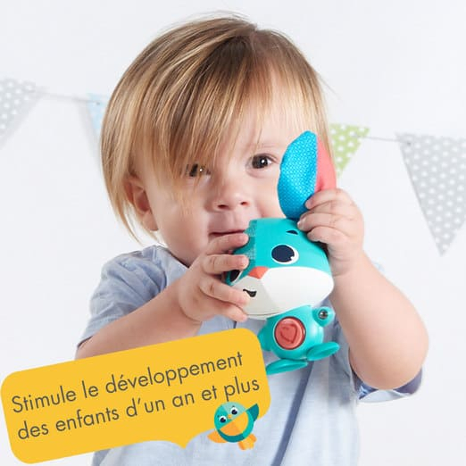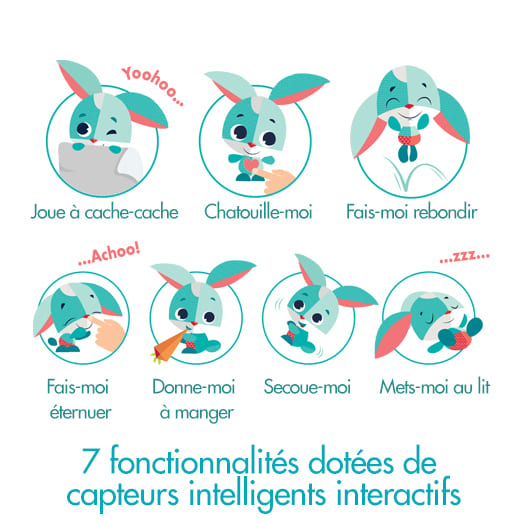 > Jouet interactif & éducatif pour enfant 1an+ > Compagnon d'éveil en forme de lion, lapin ou souris > 7 Activités > livré avec 1 accessoire d'animation représentant son repas préféré > cartes conseil d'animation > 7 types d'animation ( cache cache / eternument/ chatouille/ dormir/ manger/ Rebond...) > Ce jouet émet des sons d'animation du type « Ouhouh/ Yeah » mais ne parle pas Caractéristiques techniques : - Personnage interactif + accessoire sensoriel. - 7 types d'interaction : cache-cache, éternuement, chatouilles, dormir, manger... - Cartes conseils pour découvrir le personnage. - Fonctionne avec 2 piles AAA/LR3 (1,5V). - Favorise le développement cognitif, le langage, l'intelligence émotionnelle et la créativité. Thème : Thomas le lapin