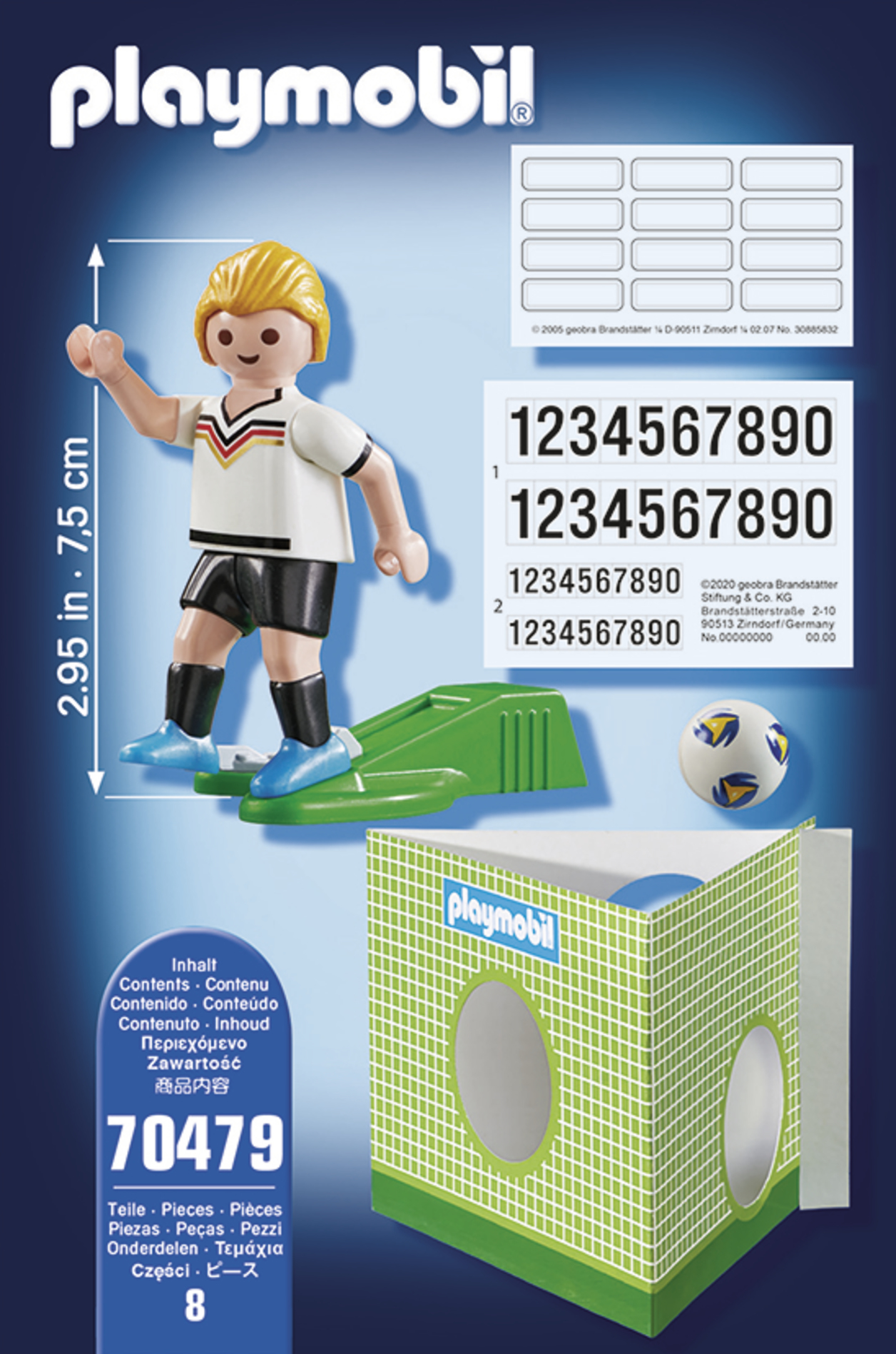Joueur de football avec fonction de tir à une main, un ballon, une cage pour s'entraîner à marquer des buts et des numéros pour le maillot. Maillot avec l'emblème de l'équipe de l'Allemagne. Le joueur permet de compléter l'équipe du Grand terrain de football transportable.