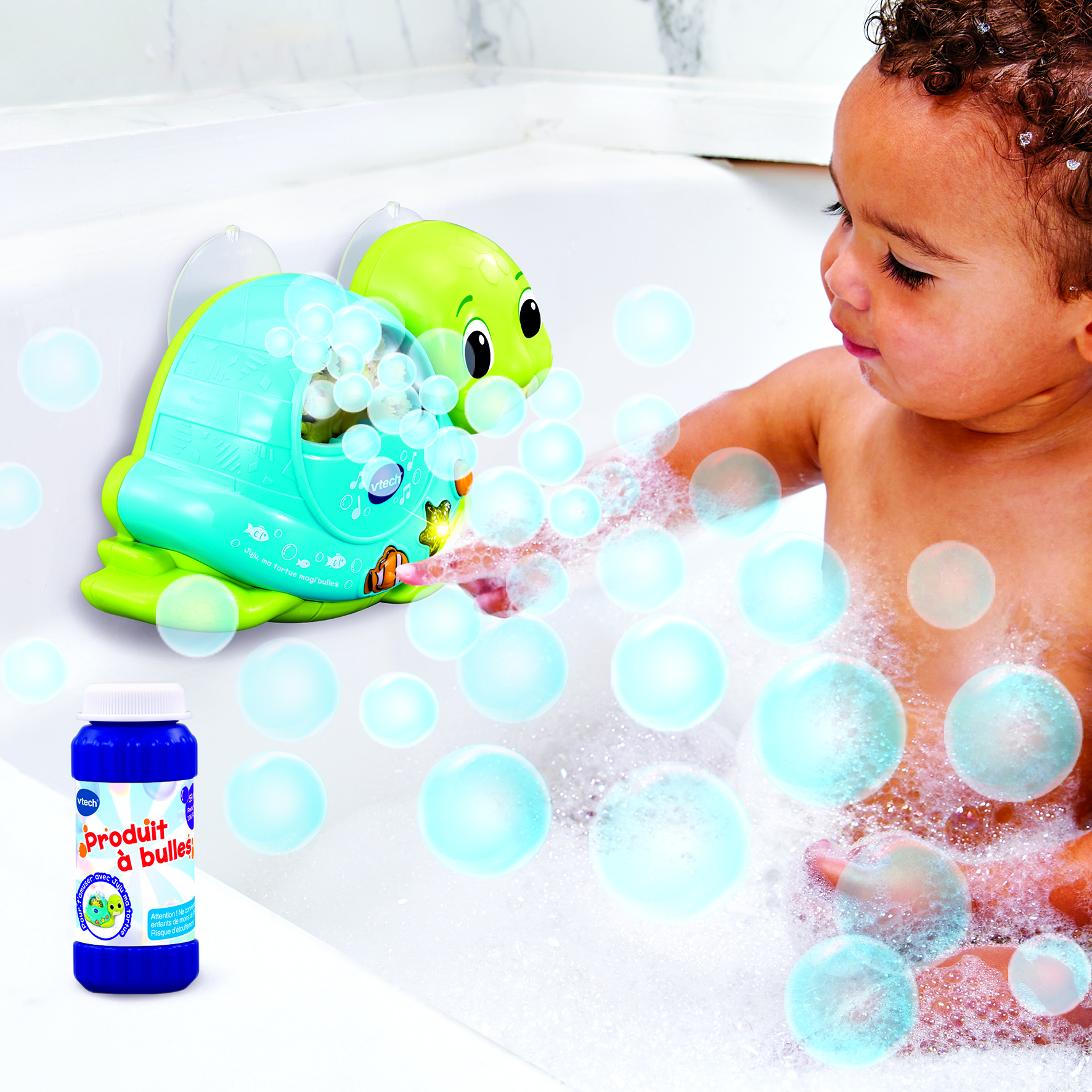 Juju, ma tortue magi bulles - 1 - 5 ans Une jolie tortue de bain qui projette des bulles ! Magique ! Juju fabrique des bulles qui volent dans le bain de Bébé tout en déclenchant de la musique ! Ses 2 boutons interactifs (un bouton poisson clown et un bouton étoile de mer) permettent de déclencher des phrases, des chansons, des mélodies et des sons amusants. Grâce à ses deux ventouses, Juju la tortue se fixe facilement aux parois d’une baignoire. Produit à bulles inclus. 4 chansons et 12 mélodies. Arrêt automatique. Boîte Try-me. Fonctionne avec 3 piles LR6 fournies.