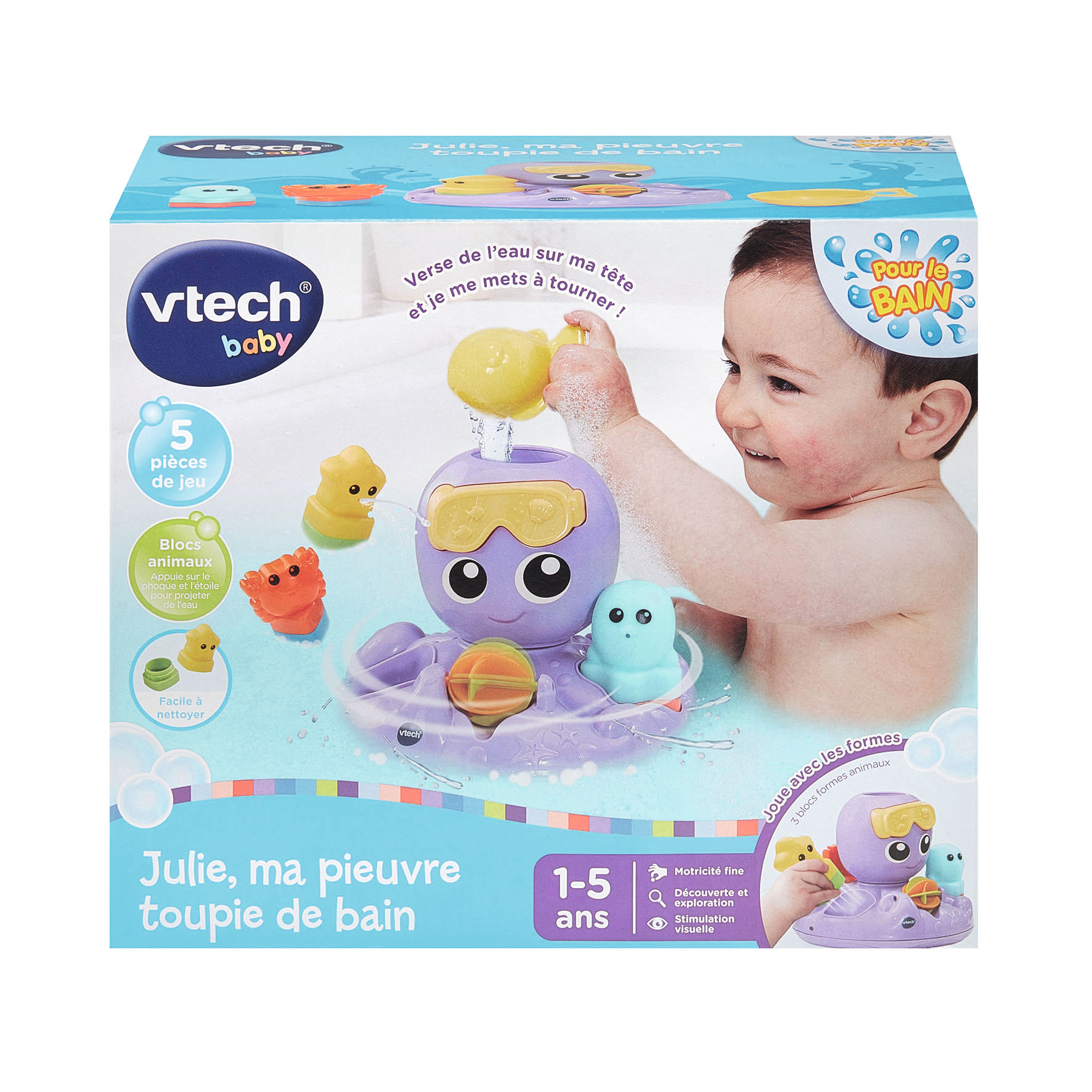 Julie, ma pieuvre toupie de bain - 1 - 5 ans Une toupie Pieuvre et ses 4 accessoires pour amuser et éclabousser Bébé pendant le bain ! Julie, la pieuvre toupie est un jouet de bain trop rigolo ! • Lorsque Bébé met de l’eau sur sa tête grâce au verseur Poisson, elle se met à tourner comme une toupie pour l’amuser ! • Elle crée ainsi des mouvements dans l’eau et permet à Bébé de comprendre la relation de cause à effet. • Elle est accompagnée de 3 Animaux Formes avec gicleur pour prolonger le jeu. Et pour encore plus de découvertes, la pieuvre possède 3 emplacements Formes pour que Bébé s’amuse à trier les animaux et les placer au bon endroit. Jouet non-électronique.