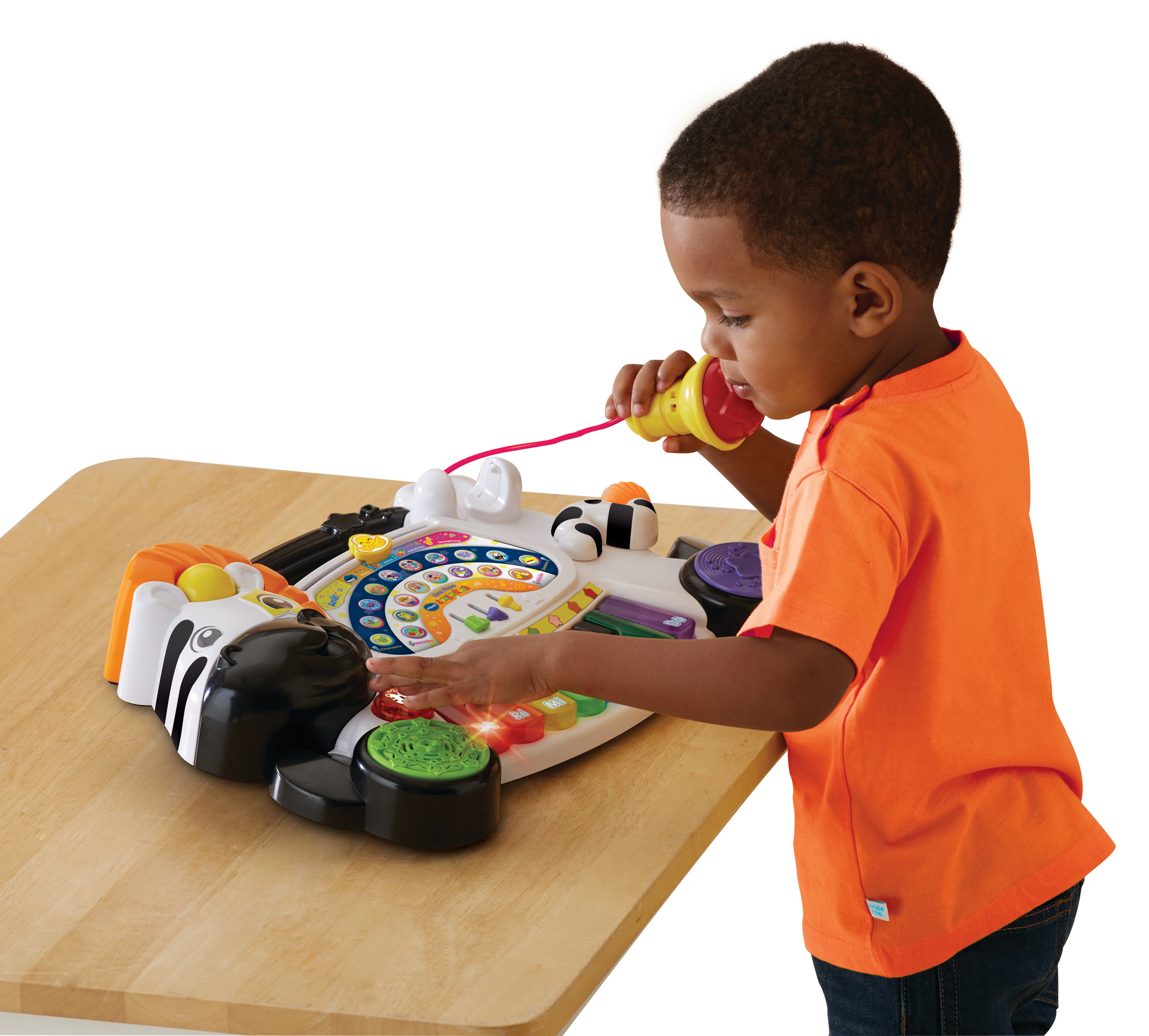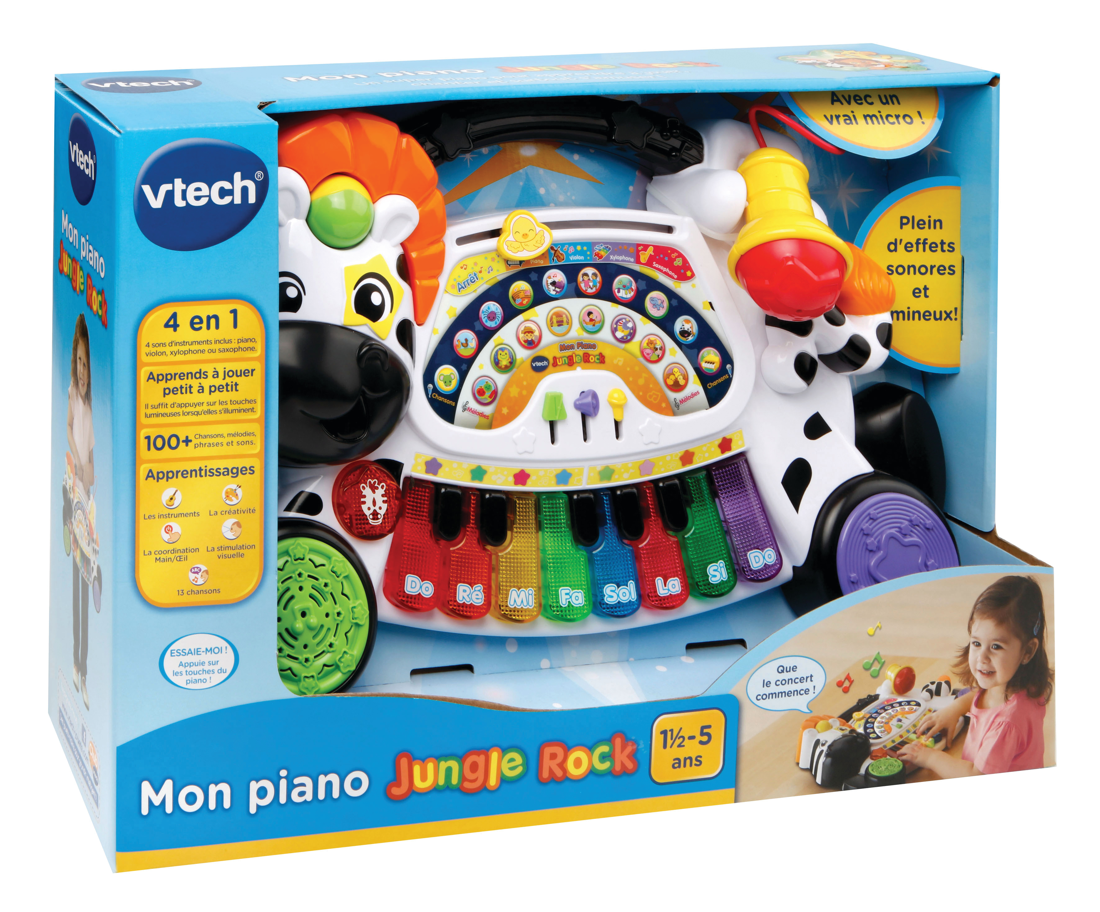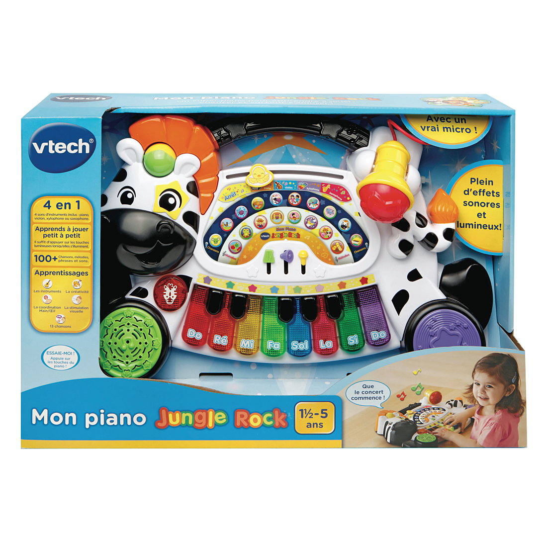 Mon piano Jungle Rock - 1,5 - 5 ans Le zèbre invite l'enfant à jouer avec lui et l'initie à la musique ! 4 modes de jeu avec un instrument de musique différent à découvrir : - piano - violon - xylophone - saxophone 8 touches lumineuses pour découvrir les notes de musique, leur son et composer ses propres morceaux. Un tableau d'activités pour déclencher 10 chansons et 8 mélodies. Les touches de piano s'illuminent une à une pour que l'enfant apprenne à jouer. Un vrai micro pour chanter sur la mélodie comme un petit fou. Un bouton « Concert Jungle Rock » pour entendre le zèbre et ses amis jouer en groupe et chanter tous ensemble et 1 bouton Scratch pour ajouter des effets à la musique. La queue du zèbre déclenche des sons rigolos. 13 chansons, 8 mélodies et des sons rigolos d'animaux. Prise en main facile grâce à la poignée de transport, jouet adapté aux enfants dès 18 mois. Réglage du volume sonore. Boîte Try-me. 2 piles AA-LR6 fournies.