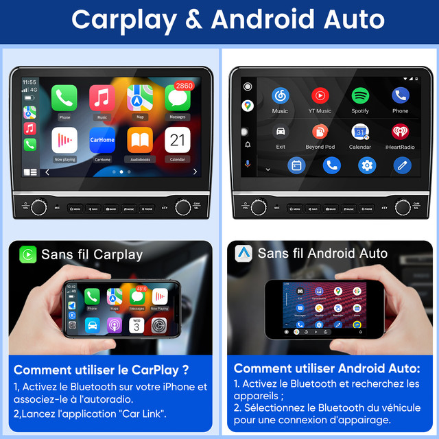 Intégration Smartphone Sans Fil : Profitez de CarPlay sans fil et Android Auto sans fil. Accédez facilement à Spotify, WhatsApp, Waze et Google Maps directement sur l'écran de la radio, via la connexion Bluetooth 5.0 et le WiFi.