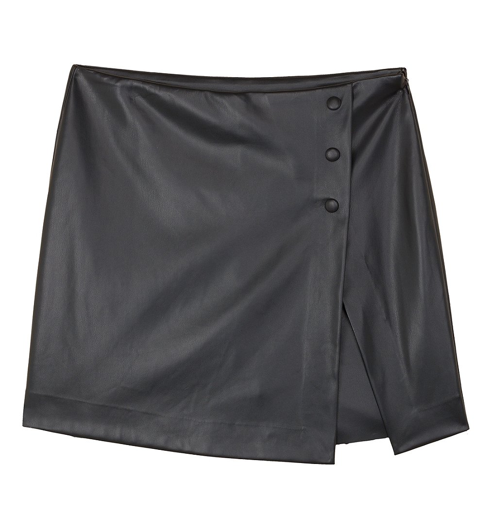 Jupe-short noire en similicuir, forme portefeuille avec boutons ornementaux, un incontournable pour une garde-robe odacieuse et moderne