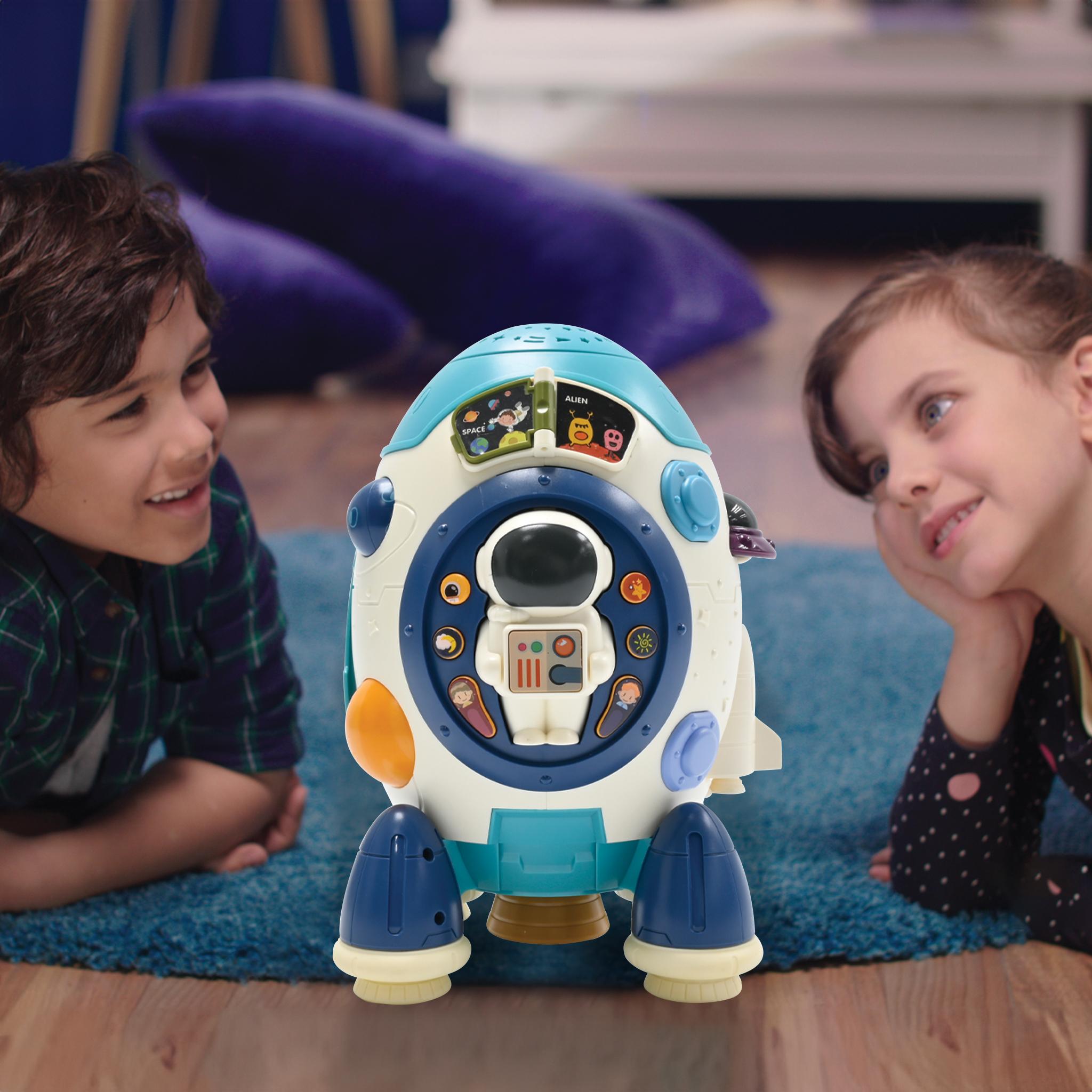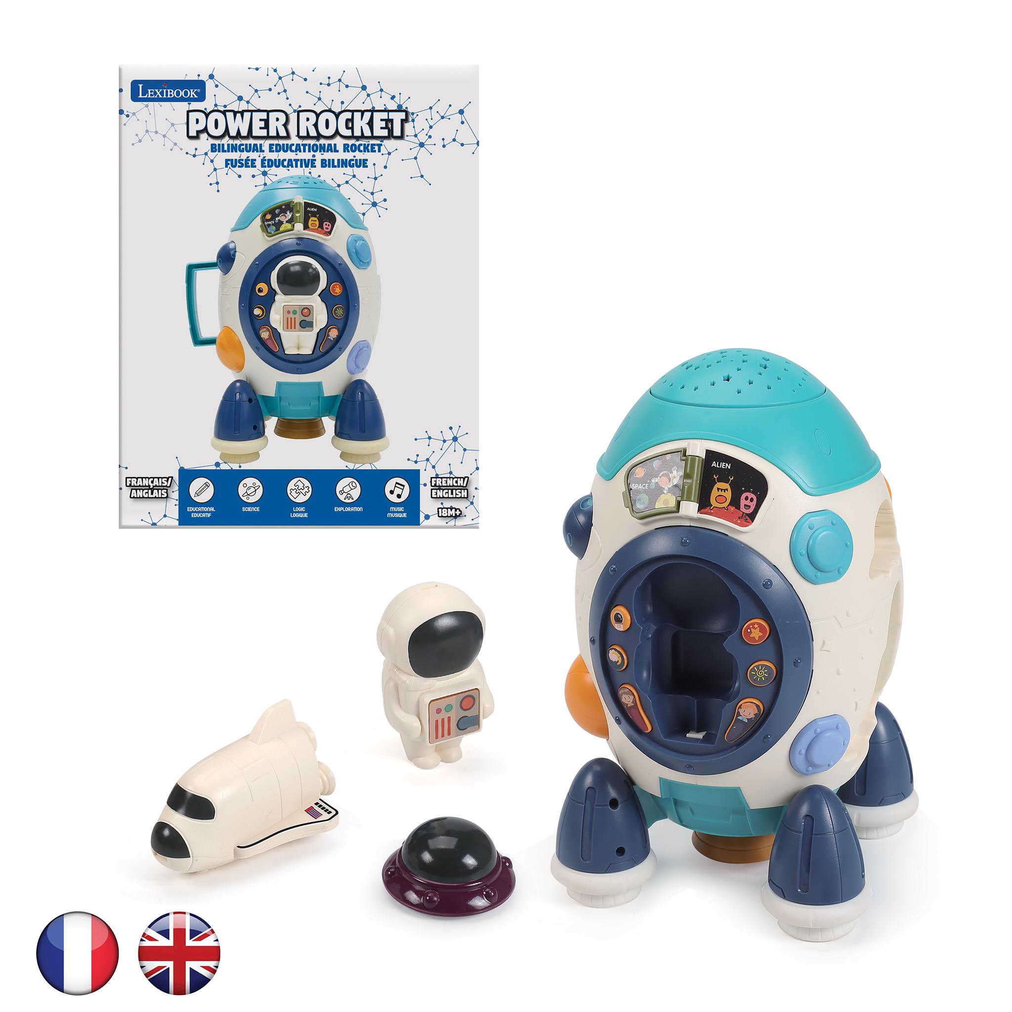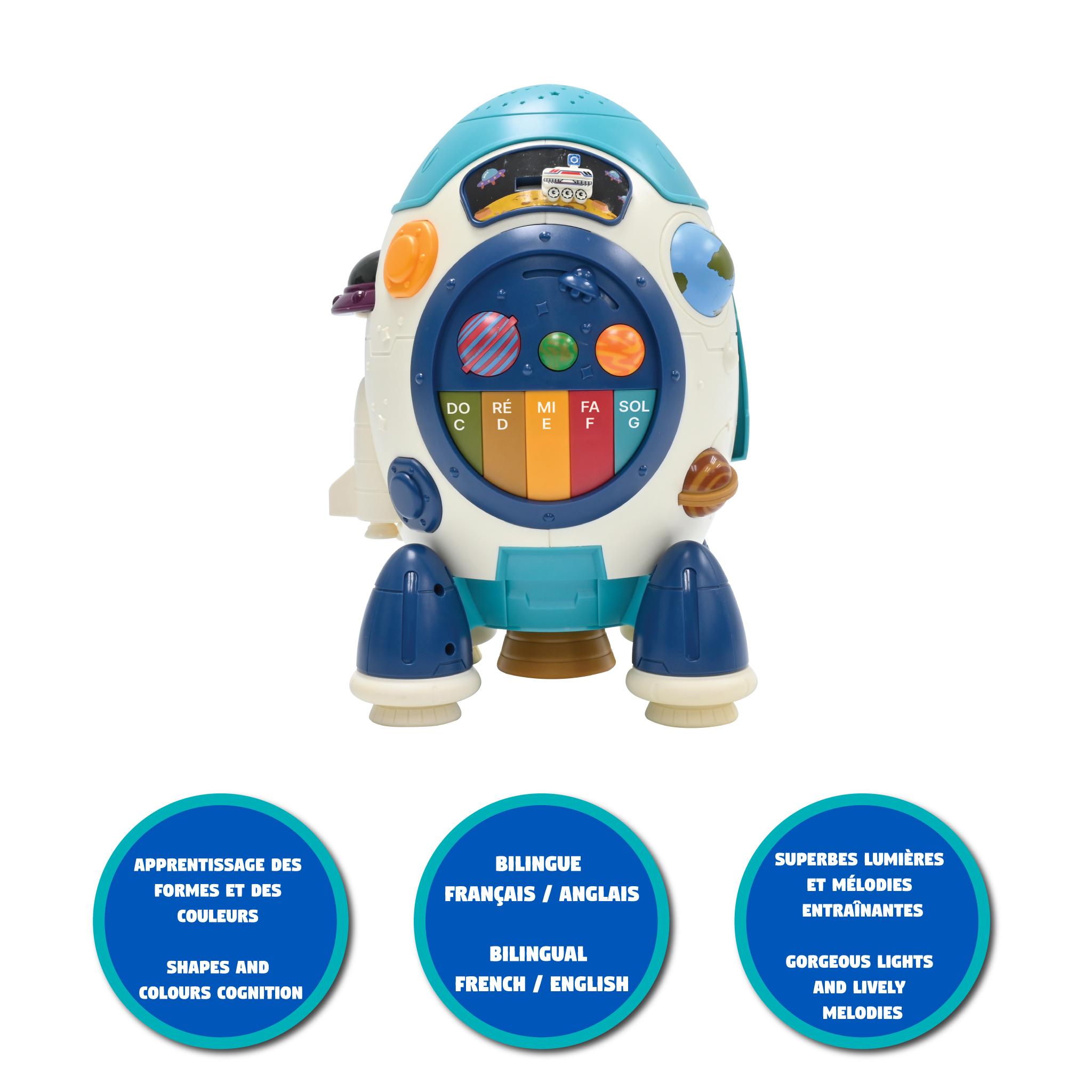 *La terre et l'espace n'aura plus de secret pour toi grâce à ta fusée ! *Découvre l'astronomie avec le projecteur d'étoiles ! *Profite des deux langues (anglais/français) pour élargir ton vocabulaire spatial ! *Initie-toi aux notions spatiales avec les superbes indications du robot. *Mets-toi dans l'ambiance avec les musques et les effets lumineux ! *Un superbe design de fusée.