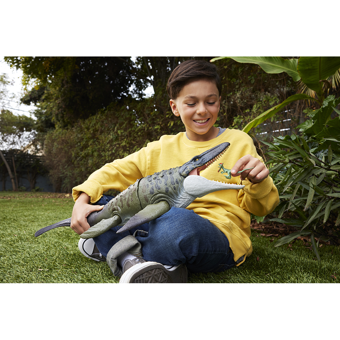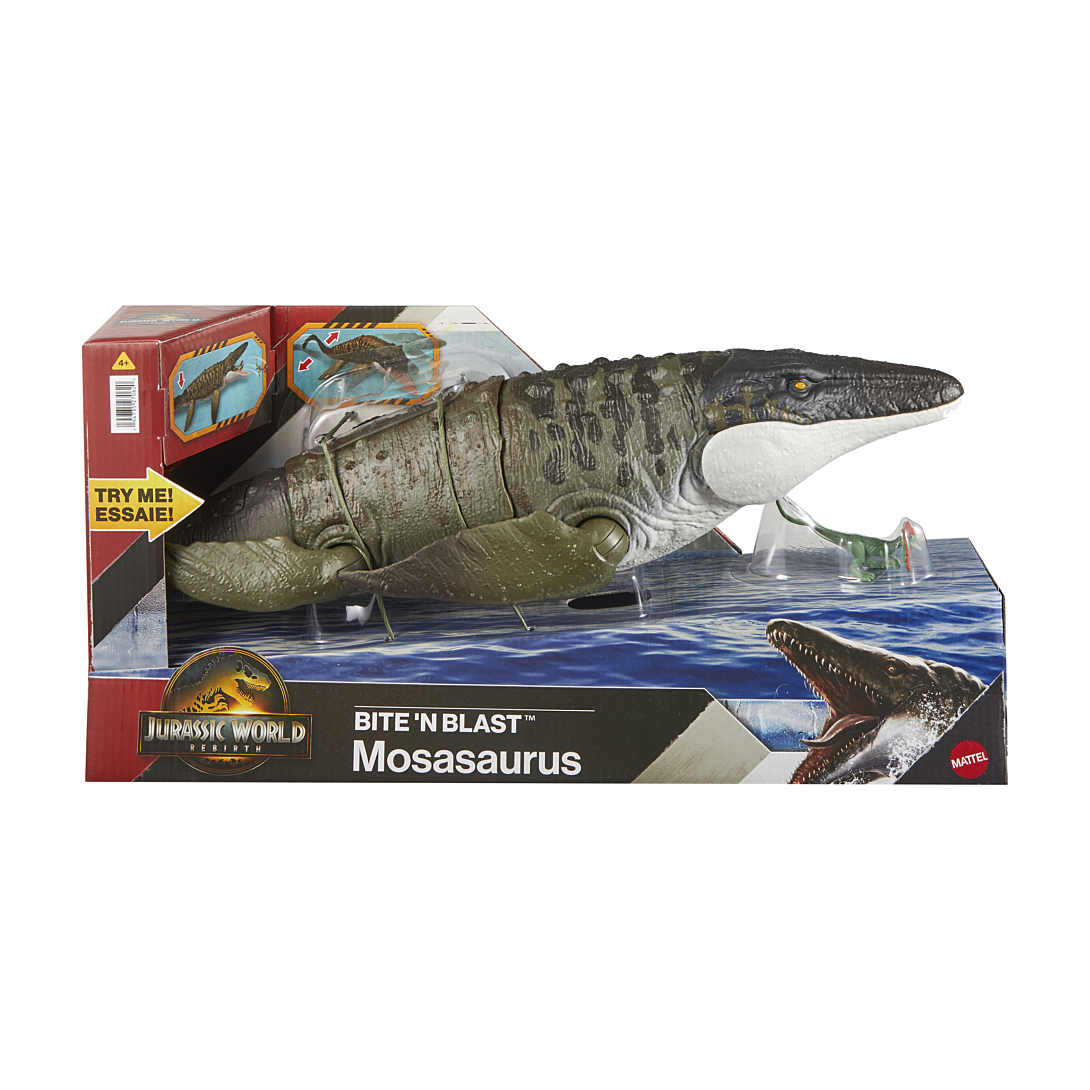 [Cet avis a été recueilli en réponse à une offre.] Le Mosasaurus est un dinosaure aquatique, plonge toi dans le monde des Jurassic world dont le dernier Renaissance. Cette figurine mesure 65cm de long et a sa mâchoire qui bouge, il a aussi une petite figurine supplémentaire un dilophosaurus. (Souviens-toi, il était dans jurassic parc lorsqu'il rentre dans la voiture et crache sur Dennis Nedry). Il peut mordre, avaler recracher des petits dinosaures supplémentaires. Il suffit d’appuyer sur le bouton pour lui permettre de croquer et de permettre de recréer et d'imaginer les scènes des films. Les enfants peuvent contrôler l’attaque en tenant la queue et en appuyant sur le bouton pour ouvrir la mâchoire et mordre. La mini-figurine de Dilophosaurus incluse peut être complètement « avalée » dans le grand corps du Mosasaurus ! Tu peux aussi bouger les nageoire car elles sont articulées. Dans l’application gratuite Jurassic World Play, scannez le code de suivi qui se trouve sous la nageoire à l’aide d’un appareil connecté compatible pour débloquer une version numérique du dinosaure et accéder à un jeu ultra-divertissant ! Faites la course avec différents véhicules sur terre, dans les airs et en mer. A partir de 4 ans.