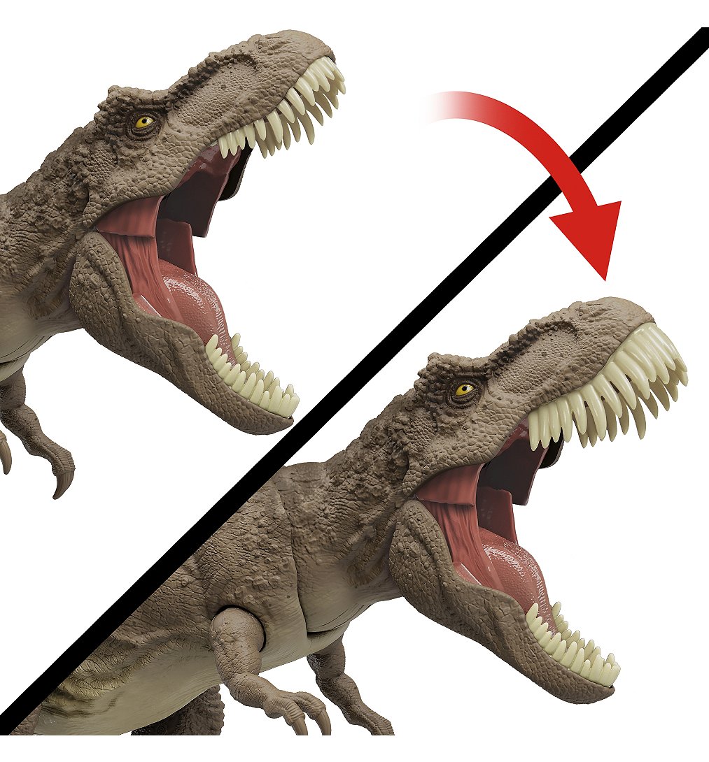Dinosaure à l’échelle avec des détails liés à son habitat naturel. Son attaque de mâchoire est deux fois plus grande et accompagnée d’un rugissement.
