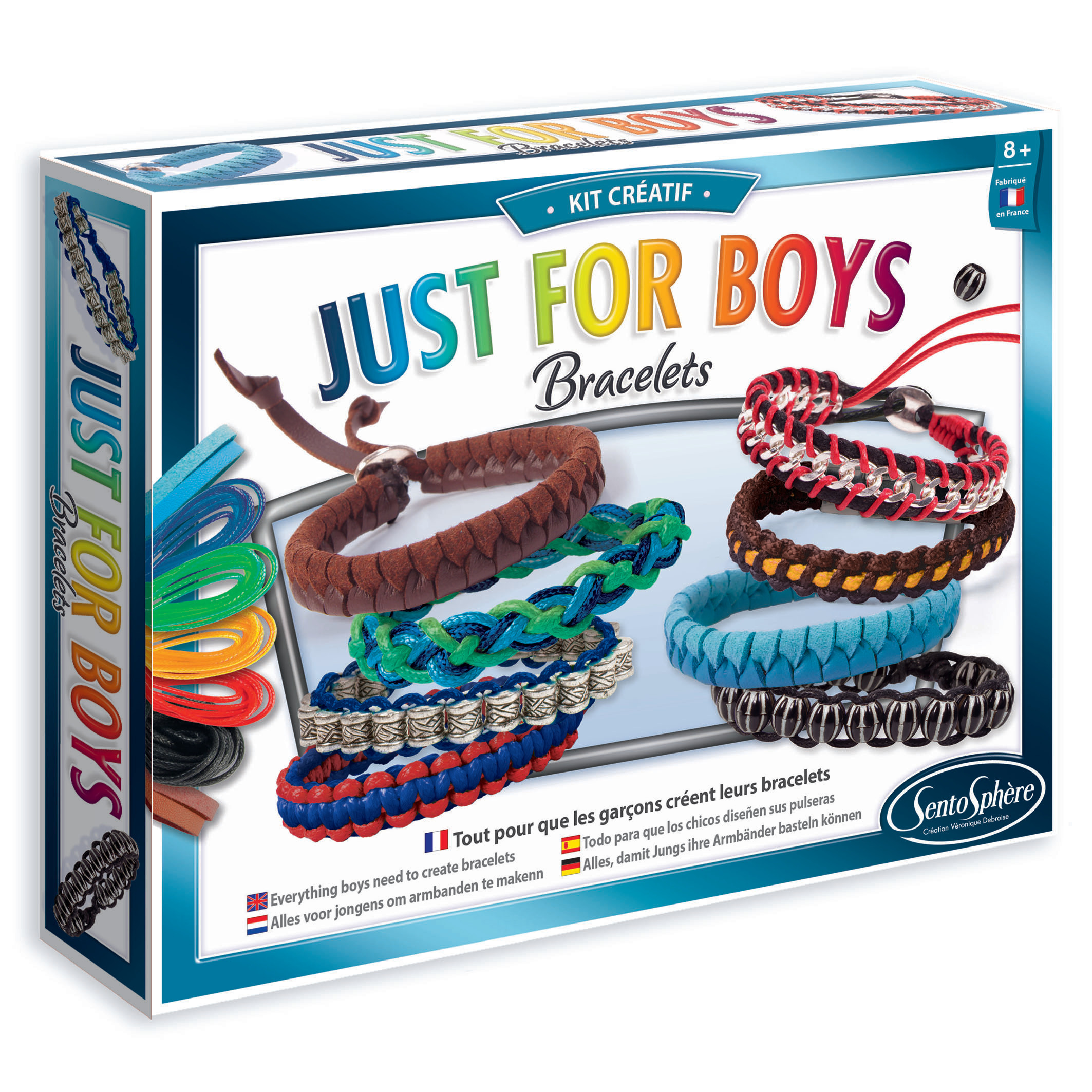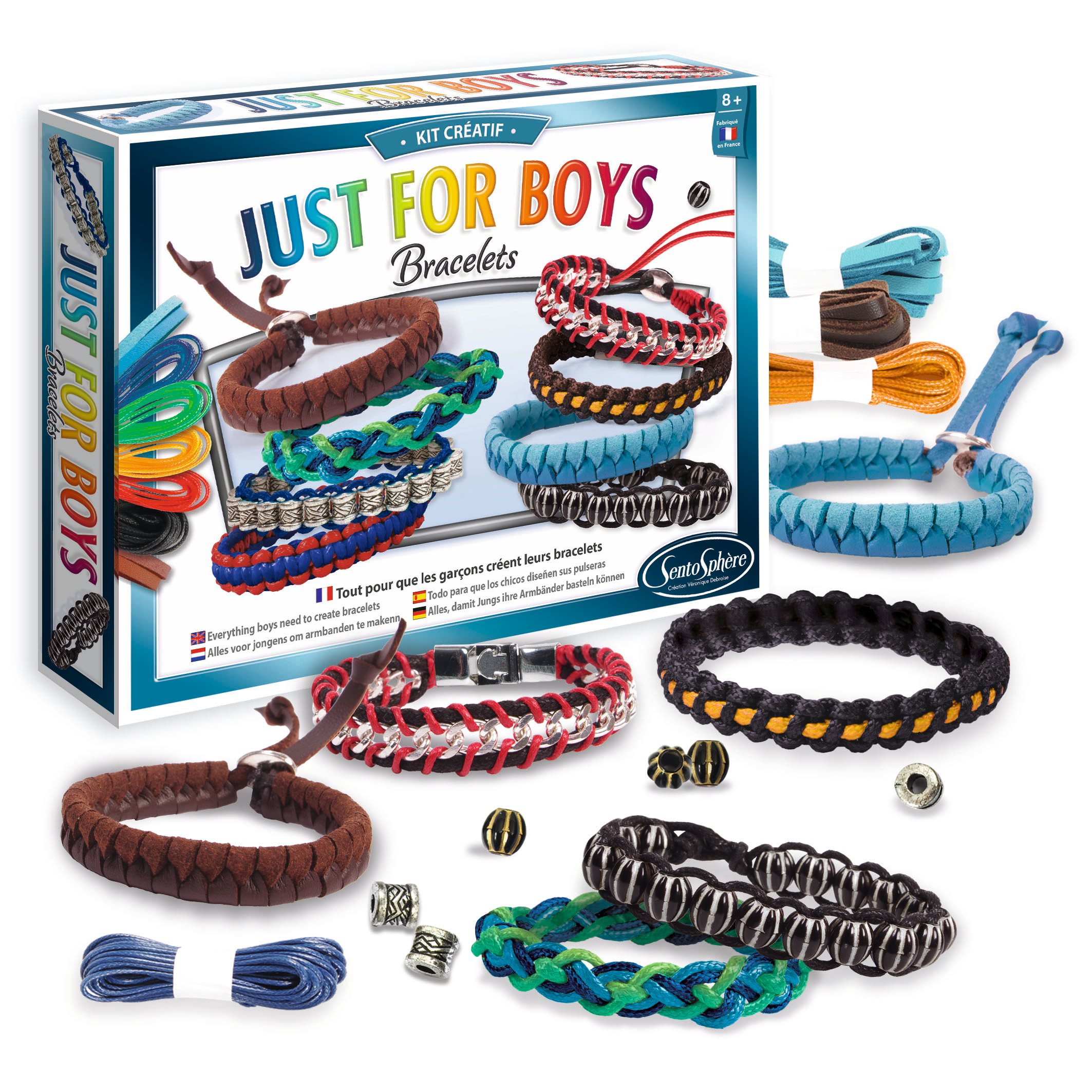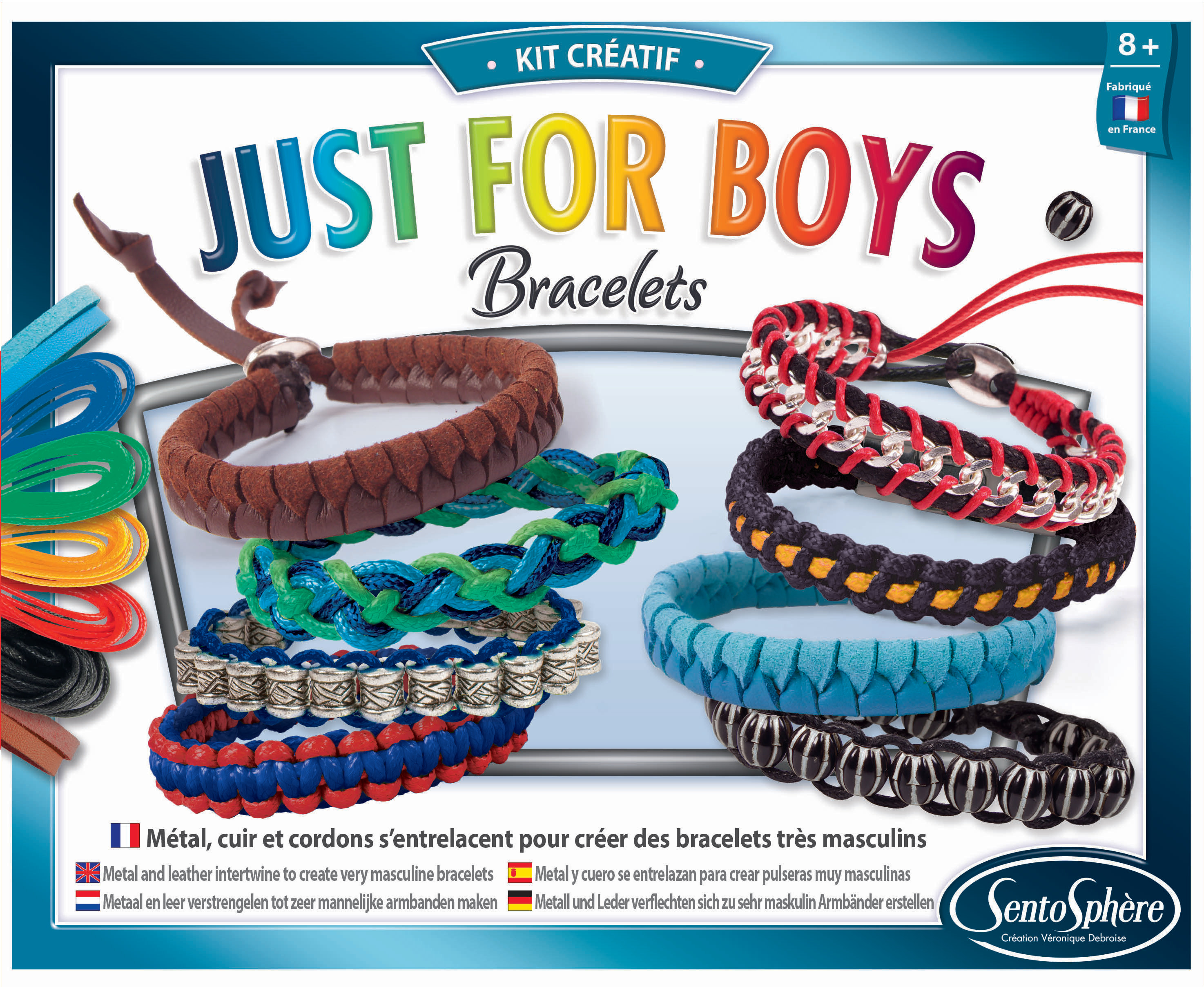 Parce que les garçons aiment aussi porter des bracelets et montrer leur habileté manuelle, ce coffret a été mis au point exclusivement pour eux. Cordons aspect cuir, chaîne en métal, perles argent vieilli : à eux de les tresser pour prouver leur dextérité !