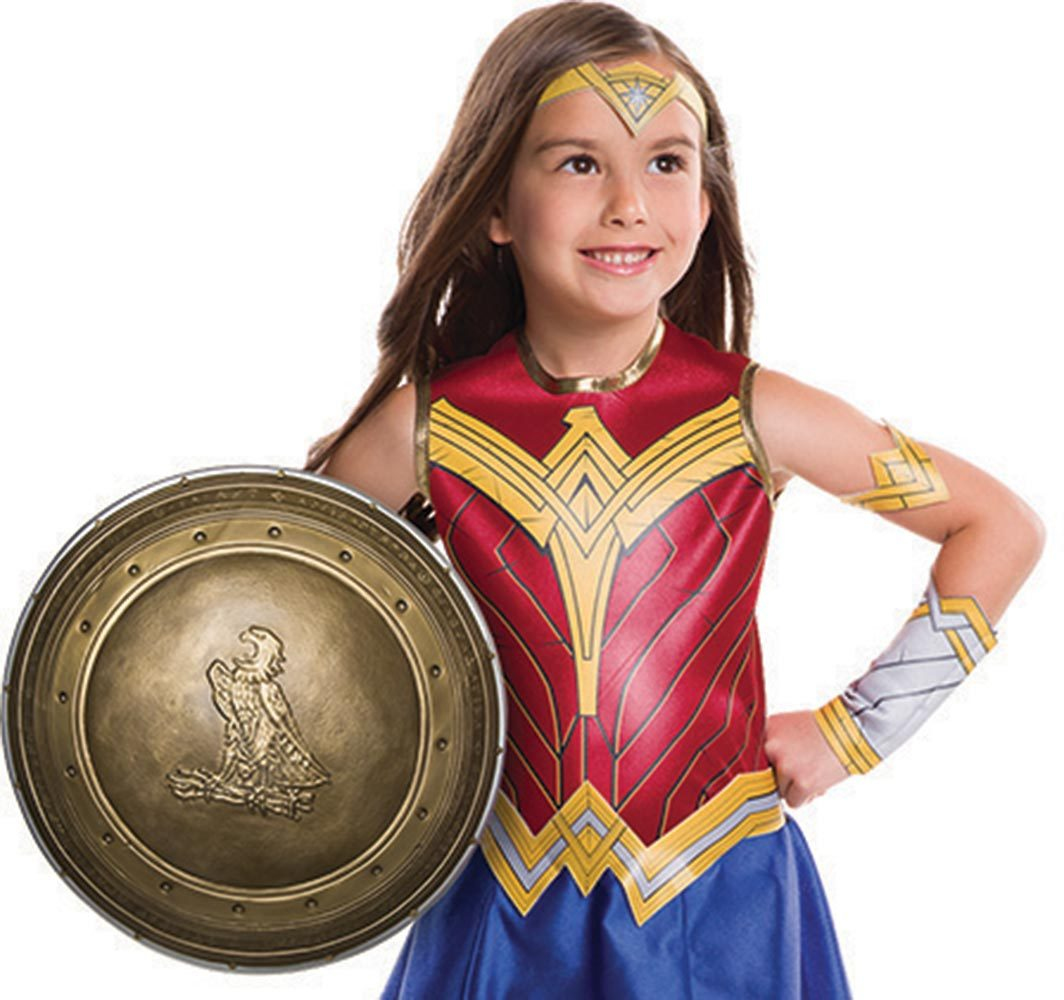 Un bouclier de 30 cm de diamètre en PVC à l’effigie de Wonder Woman. Il se tient grâce à des lanières. Accessoire indispensable pour compléter le déguisement de Wonder Woman.