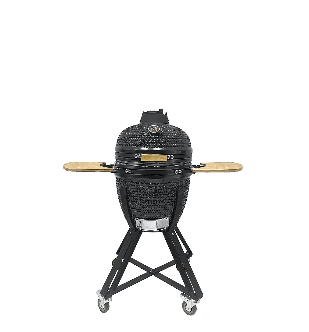 Structure en céramique; grille de cuisson en acier chromé (5x5mm); avec grille foyère en fonte; sur roulettes pour un déplacement facile; avec tables latérales pliables en bambou et avec poignée de couvercle en bois