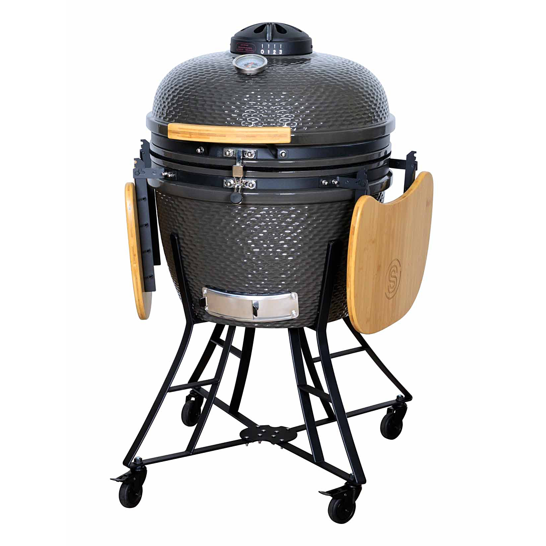 Ce barbecue Kamado / Kamagic 24 en céramique dispose d'un couvercle de cuisson, avec un système d’aération, un cendrier et un thermomètre. Cette appareil propose une large polyvalence de cuisson et une faible combustion du charbon de bois. La combustion à basse température vous permettra de cuire pendant des heures pour des aliments tendre et savoureux; vous apprécierez également la cuisson direct et indirect grâce à ses 2 grilles en acier chromé ainsi que ses 2 hauteurs de cuisson. Grâce à son chariot stable et robuste avec des tablettes latérales en bambou rabattable, vous pourrez le ranger et le déplacer aisément.