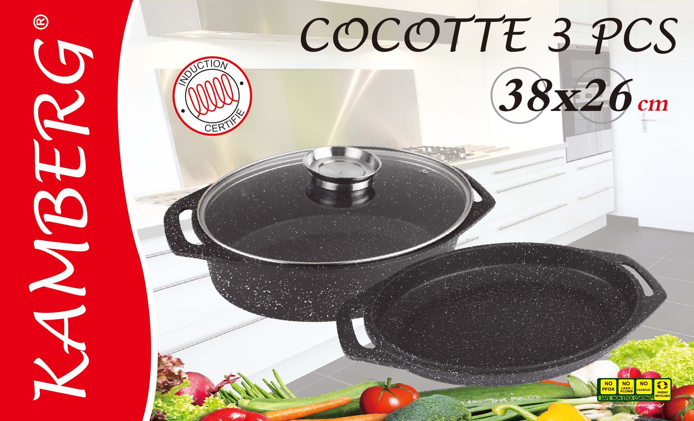 | Libellé | Kamberg - 0008049 - Cocotte 3 pièces 38 x 26 x 12,8 cm -Fonte d'Aluminium - Revêtement type pierre - Tous feux dont induction - Sans PFOA |