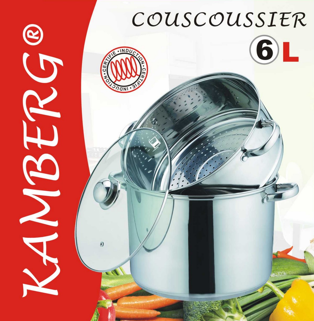 Couscoussier en inox 6 Litres de marque Kamberg - Produit 3 en 1 : couscoussier, marmite et cuit vapeur - La collection Kamberg est certifiée tout types de feux induction - Acier inoxydable haute qualité - Poignées anti-chaleur rivetées - Couvercle en verre avec poignée inox - Fond 5 épaisseurs - Diffusion optimale de la chaleur - Cuisine saine et rapide - Dimensions panier vapeur : diamètre 20 cm / hauteur 11 cm - Dimensions pot : diamètre 22 cm / hauteur 16 cm
