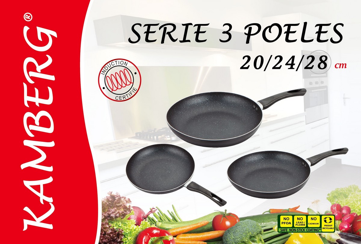 | Libellé | KAMBERG - 0008117 - Set 3 Poêles 20/24/28 cm - Aluminium Pressé - Revêtement pierre - Tous feux dont induction - Sans PFOA |