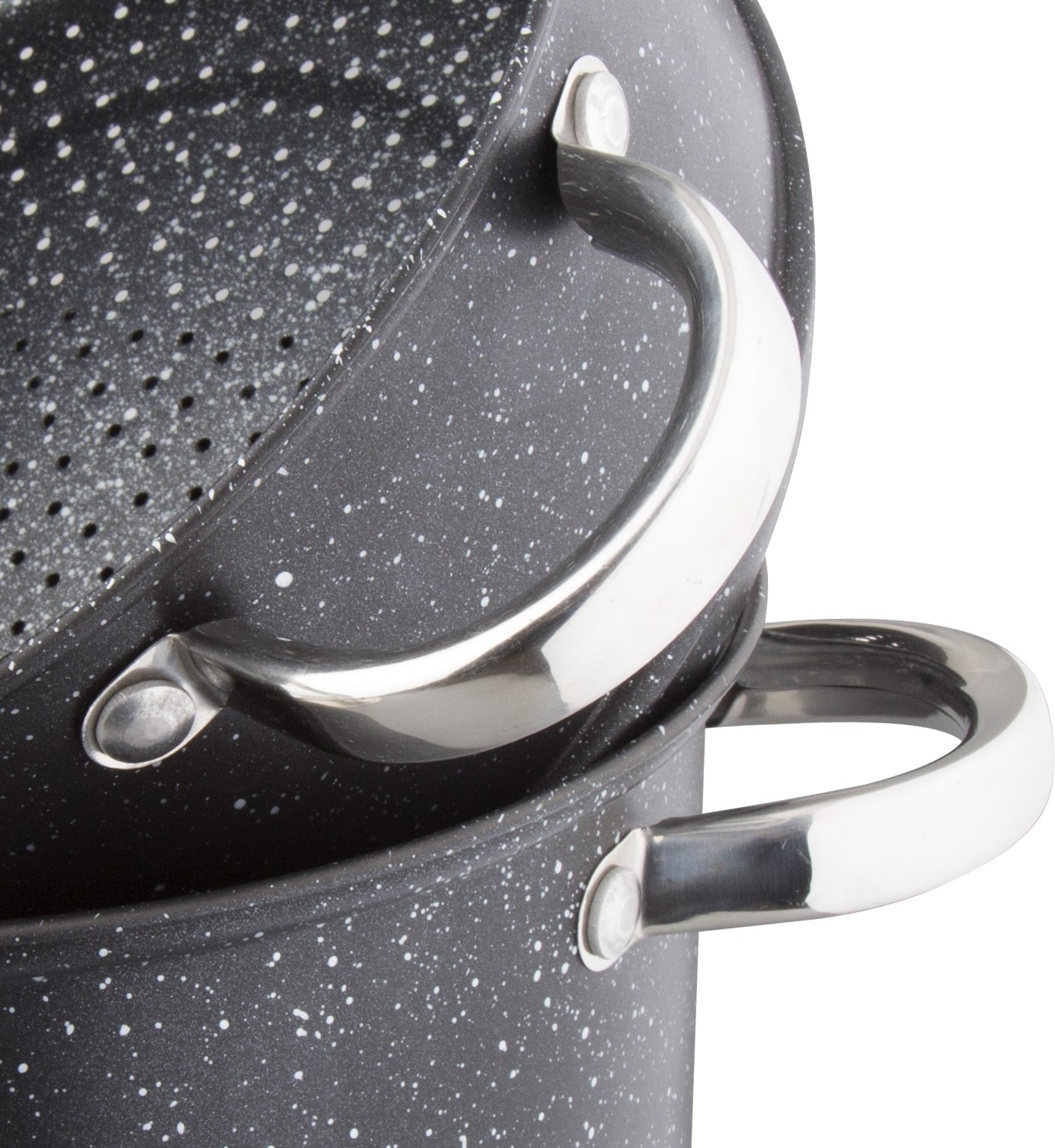 Couscoussier en acier inoxydable Haute Qualité d'une capacité de 10 Litres de marque Kamberg, avec revêtement type pierre sans PFOA intérieur / extérieur. 3 en 1 : couscoussier, marmite et cuit vapeur. La collection Kamberg est certifiée tout types de feux: induction, gaz, plaques électriques et vitrocéramiques. Acier inoxydable haute qualité. Poignées anti-chaleur rivetées. Couvercle en verre avec poignée inox. Fond 5 épaisseurs. Diffusion optimale de la chaleur. Cuisine saine et rapide. Dimensions panier vapeur: diamètre 26 cm / hauteur 12,5 cm. Dimensions pot : diamètre 26 cm / hauteur 20 cm.