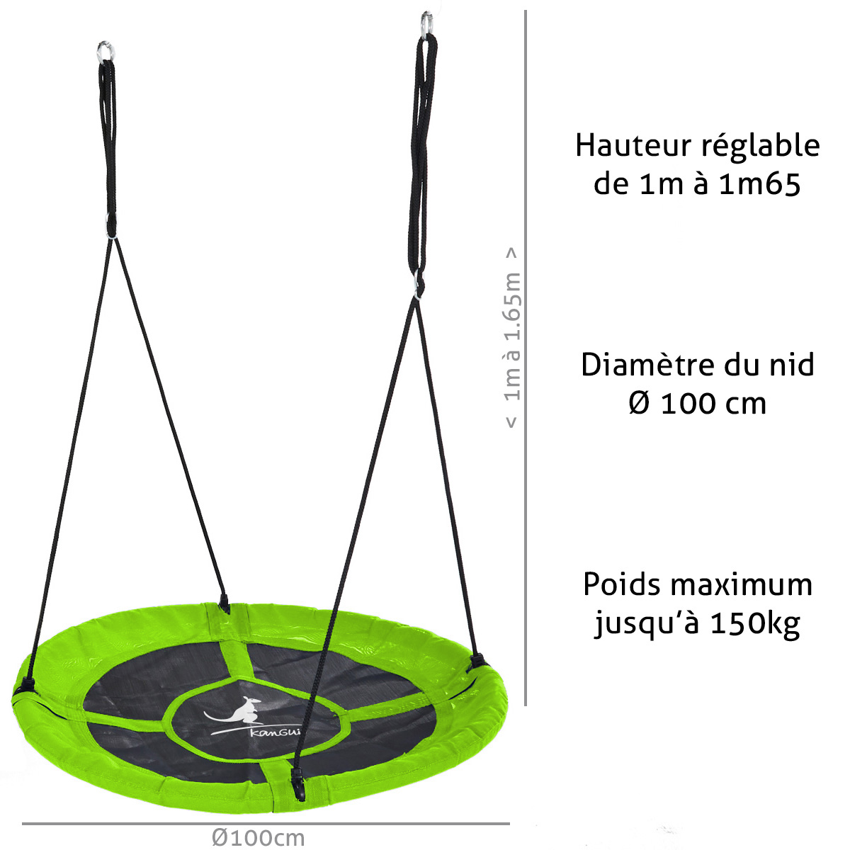 | Libellé | KANGUI - Balançoire ronde nid d'oiseau rond diam.100cm - Vert - Charge 150kg maxi |