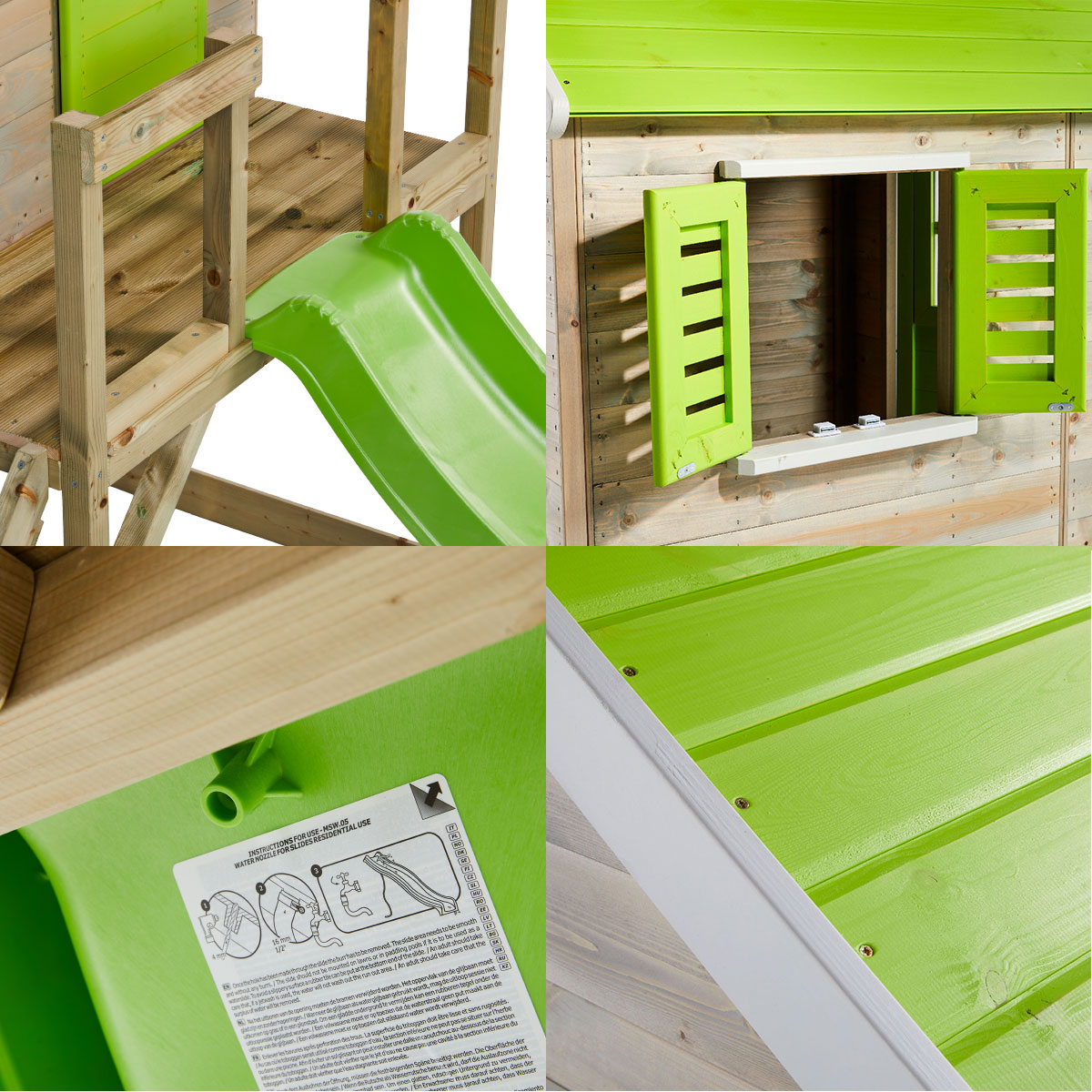 | Libellé | Kangui - Maison de jardin enfant extérieur - Cabane en Bois avec plateforme et toboggan - Toit étanche - Vert et Blanc |