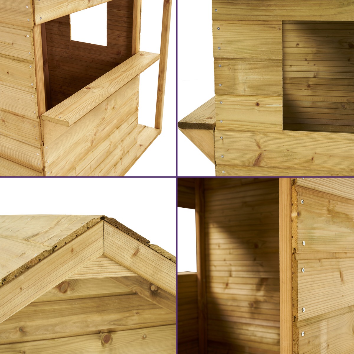 Fabriquée en bois naturel traité Autoclave III et IV pour garantir durabilité et résistance aux intempéries, la maisonnette dispose d'un toit étanche et d'un plancher en bois de 5 cm qui maintient l'intérieur sec et facile à entretenir.