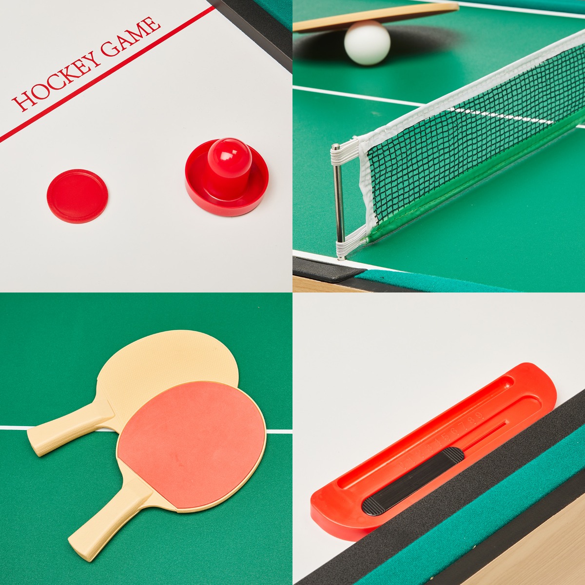Accessoires inclus : Baby-foot : 3 balles, 22 joueurs, 2 marqueurs, Billard : 2 queues 36'' (92cm), 1 set billes de billard, 2 craies, 1 triangle, Ping Pong : 3 balles de ping pong, 1 filet de ping pong, 2 raquettes de ping pong, Hockey : 2 palets(ø 5 cm), 2 poussoirs (ø 6,8 cm)