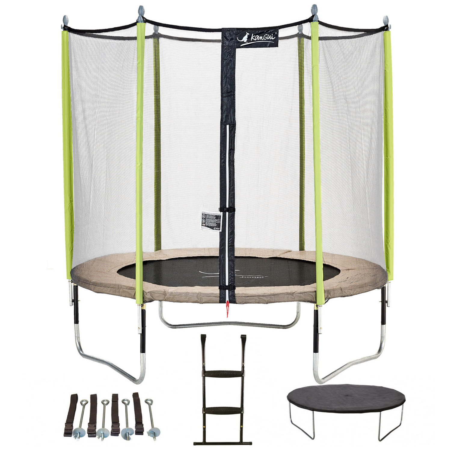 | Libellé | Kangui - Trampoline de jardin 244 cm + filet de sécurité + échelle + bâche de protection + kit d'ancrage JUMPI Taupe/Vert 250 |