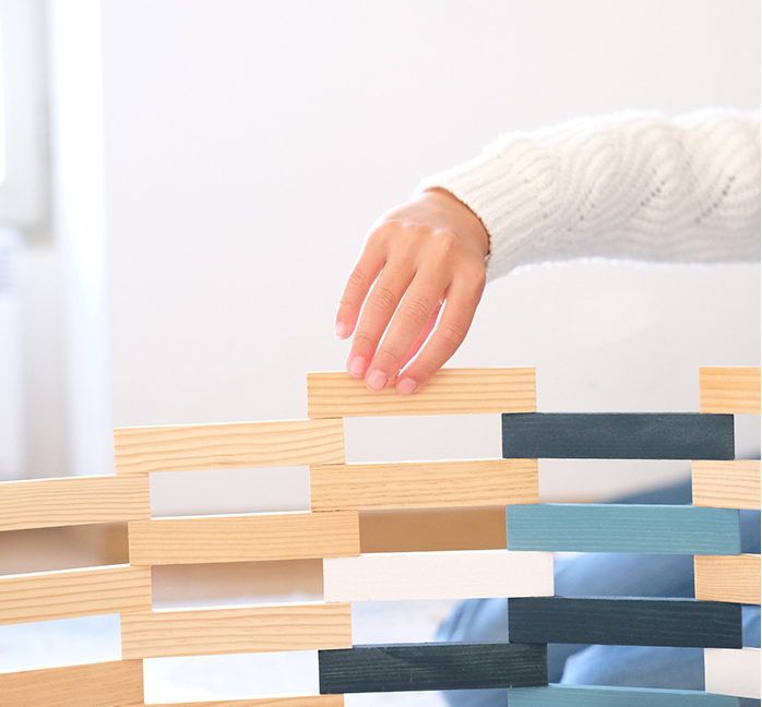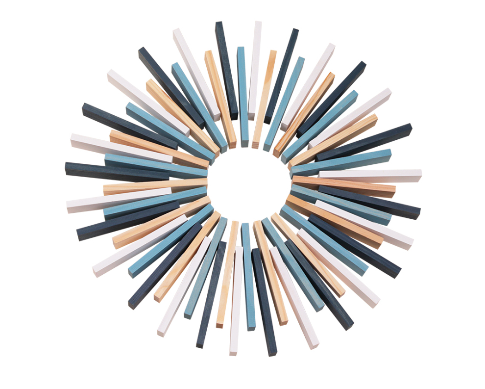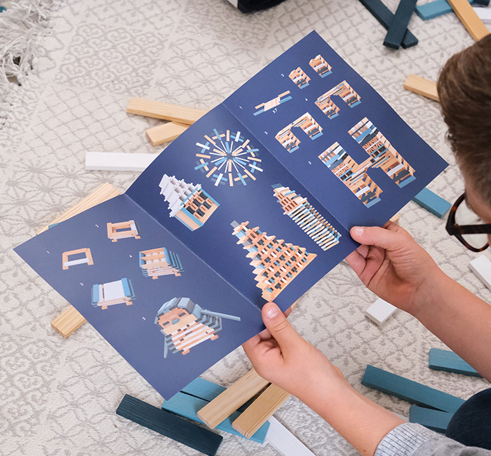 La Baril Hiver contient 200 planchettes de pin des Landes naturel dont 140 planchettes natures, 20 planchettes blanches, 20 planchettes bleu clair et 20 planchettes bleu foncé ainsi qu'un triptyque format A5 présentant 3 constructions inédites étape par étape.