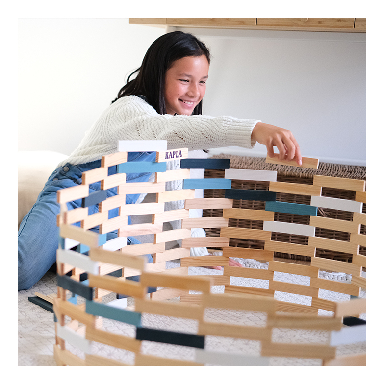 Les planchettes KAPLA, toutes de taille identique, permettent de jouer et de créer à l’infini. Les planchettes sont simplement empilées, sans colle ni attache, et l'on construit au gré de son imagination…