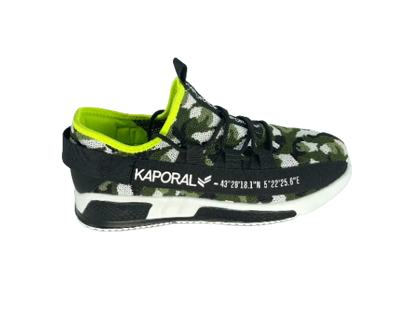 Baskets Kaporal, modèle simple et tendance, imprimé militaire kaki et blanc avec des touches de jaune fluo, on retrouve le logo de la marque sur les côtés et sur la languette.