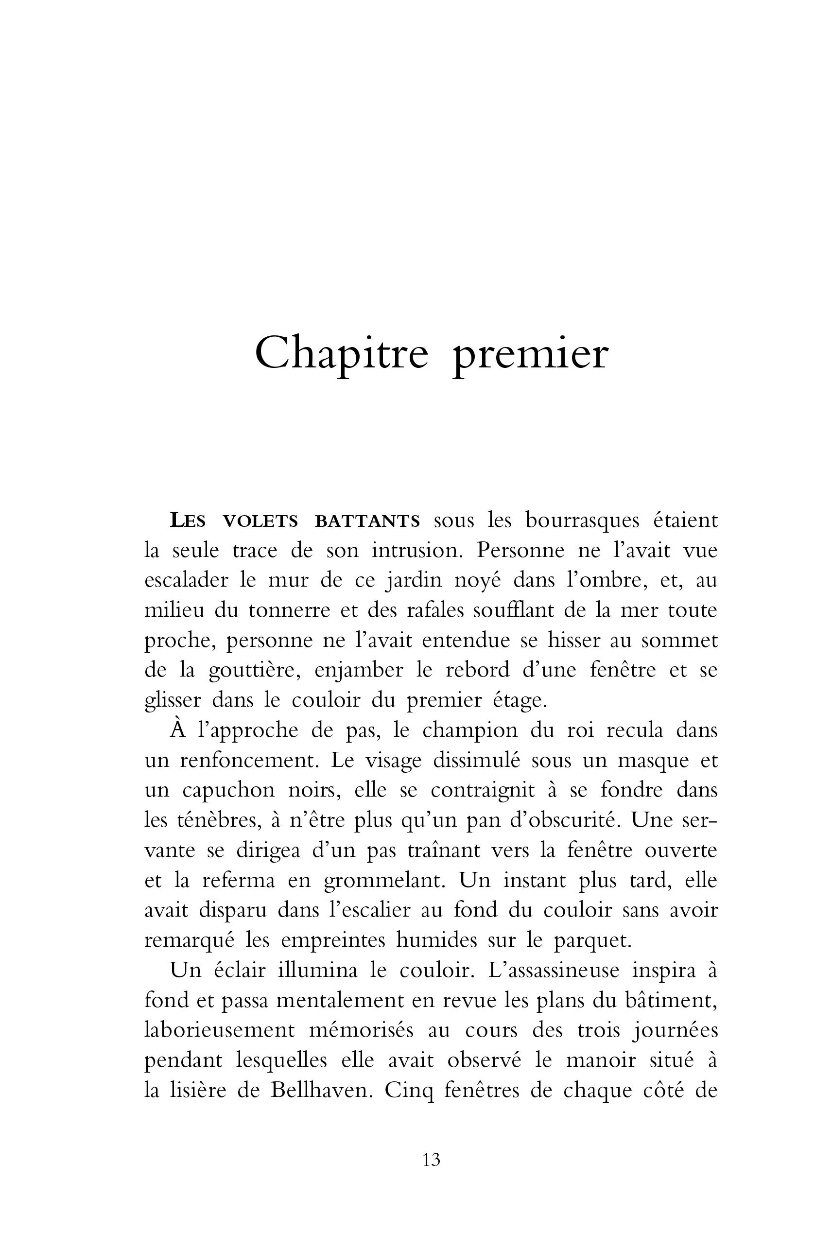 Pour échapper au bagne, Keleana est devenue le champion du roi d’Adarlan. Loin d’être loyale à la couronne, elle doit pourtant aider le tyran à éliminer ses ennemis. Mais elle a beau avoir été l’assassineuse la plus redoutable du continent, Keleana refuse de tuer aveuglément et doit ruser pour simuler la mort de ses cibles.