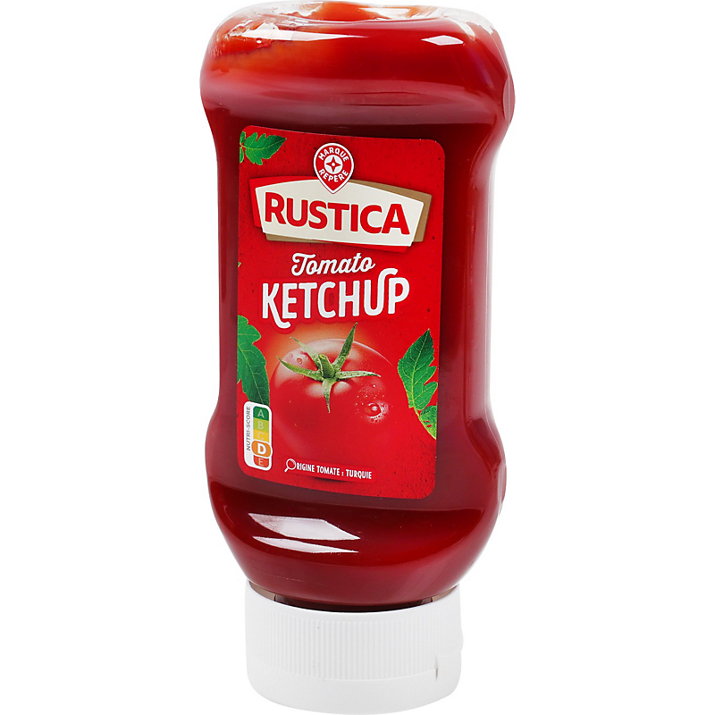 Ingrédients: Purée de tomates 71,3 % (eau, concentré de tomates), sucre, vinaigre d'alcool, sel, arôme naturel, oignon en poudre, ail en poudre.