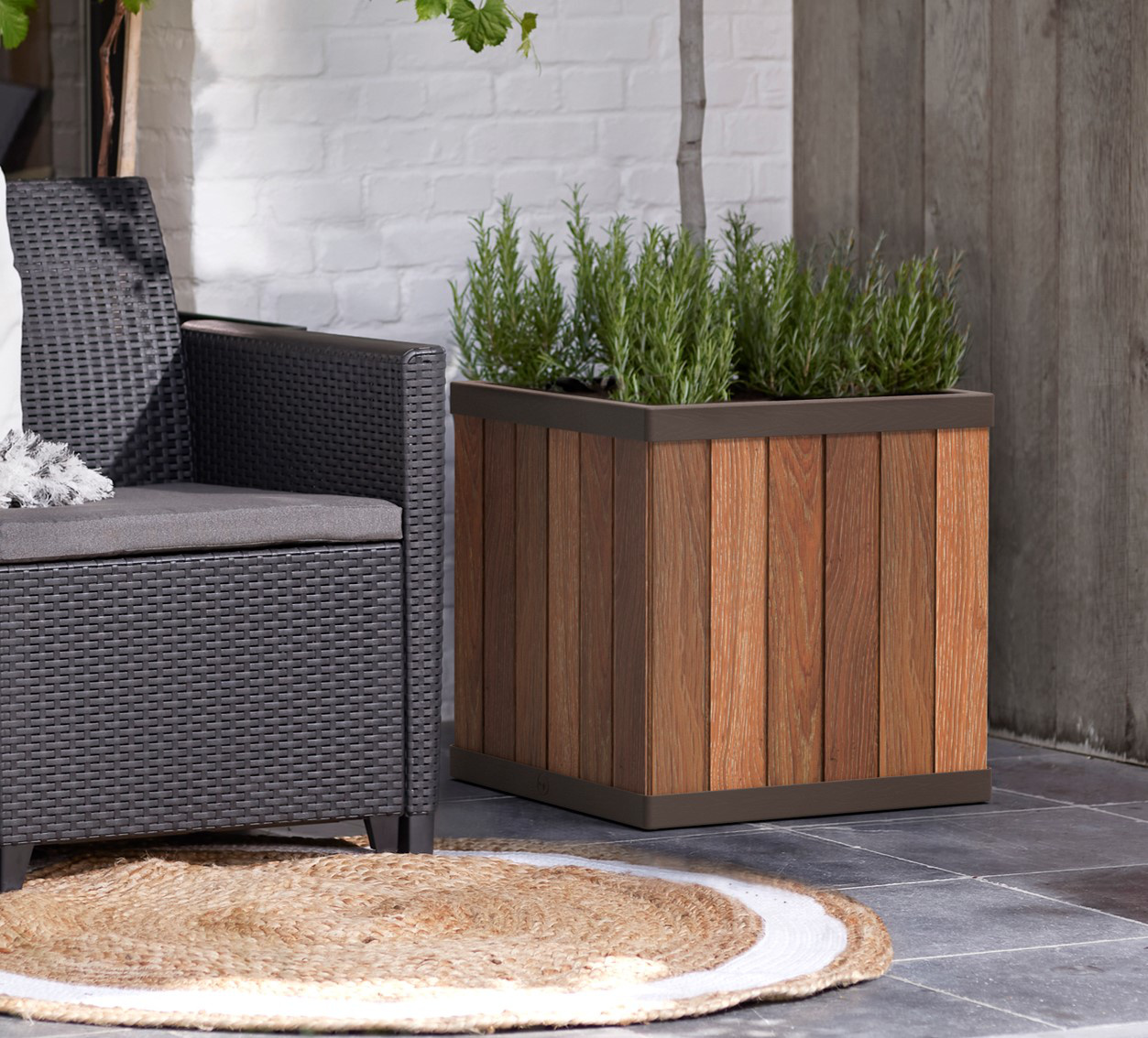 Ce pot de fleurs carré de 45,5 x 45,5 x 45,5 cm offre un mariage parfait entre design et fonctionnalité avec sa jolie structure imitation lattes de bois. Idéal pour cultiver vos plantes ou vos légumes, il ajoutera une touche de style à votre jardin. D'une capacité de 61 litres, il intègre un système de réserve d'eau avec contrôle du niveau pour un arrosage optimal de vos plantes. Conçu en polypropylène de coloris marron traité anti-UV, il résiste aux intempéries et ne nécessite aucun entretien. Livré à plat, il se monte en un clin d'œil, en seulement 1 minute. Il est garanti 2 ans.