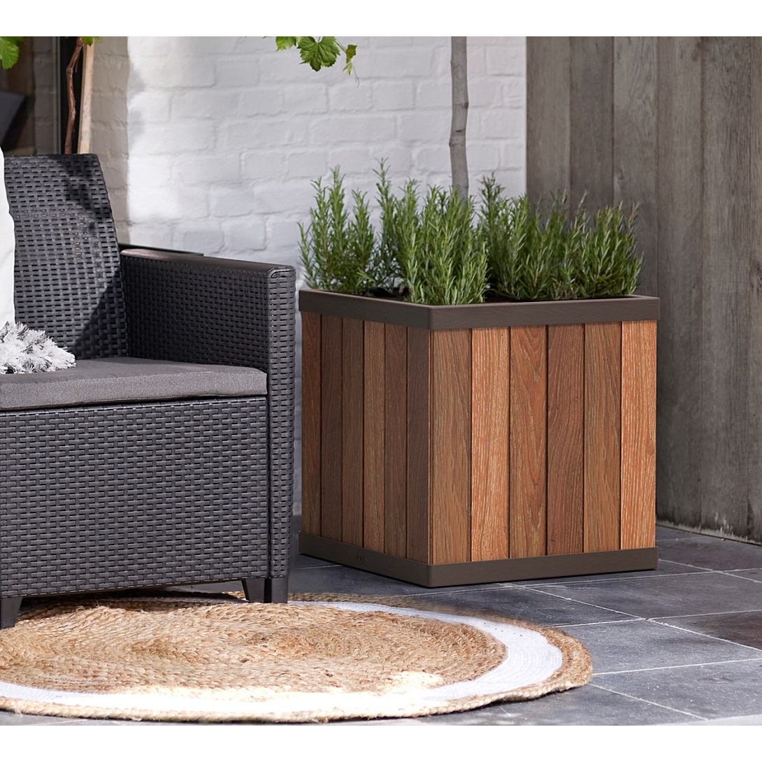 KETER - Pot de fleurs carré en résine coloris marron imitation lattes de bois 45,5x45,5 cm