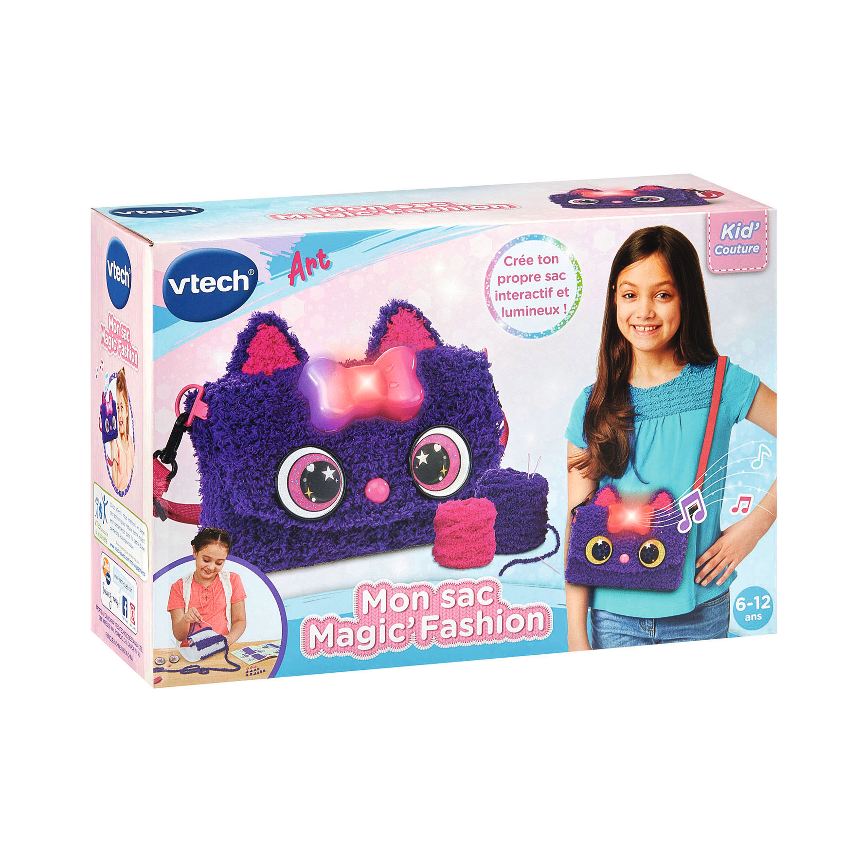 Kid'Couture - Mon sac Magic'Fashion (chat) - 6 - 12 ans Un sac 100% fait main, à coudre et à assembler pour porter fièrement sa création et interagir avec elle ! Grâce aux instructions du guide de création, l’enfant crée pas à pas un adorable sac en forme de chat qui se transforme aussi en compagnon interactif. Tous les accessoires pour créer son sac sont inclus dans la boîte : caneva en plastique, 2 bobines de fils, aiguilles en plastique, sangle ajustable en nylon, accessoires à clipser (nez et yeux), nœud lumineux et module électronique. Magique ! Le nœud du chat réagit quand on le touche et déclenche des sons amusants et des effets lumineux. 3 modes de jeu permettent d’interagir avec le sac une fois assemblé : - Mode Lumières : pour découvrir 18 variations lumineuses en touchant le nœud magique - Mode Musical : pour écouter 11 mélodies et voir le nœud s’illuminer en rythme - Mode Fashion’Motion : pour déclencher des effets sonores et lumineux en secouant le sac. Plus qu’un simple sac, Mon sac Magic’fashion est un accessoire de mode unique et fait main pour développer la créativité de l’enfant et l’initier à la couture et aux loisirs créatifs ! Arrêt automatique. Boite fermée. Fonctionne avec 2 piles LR6 non fournies.