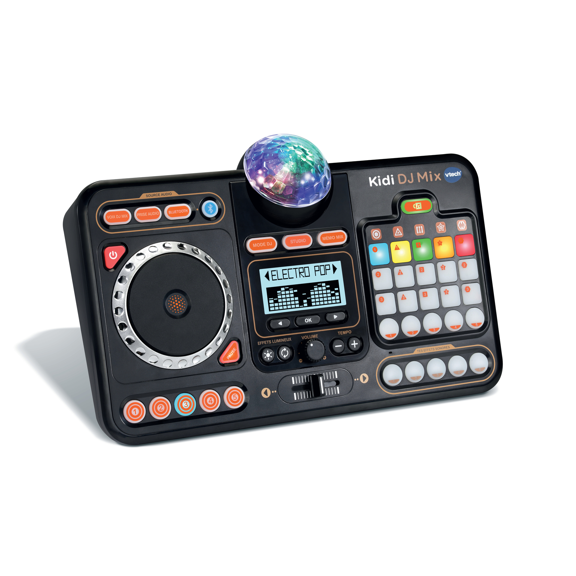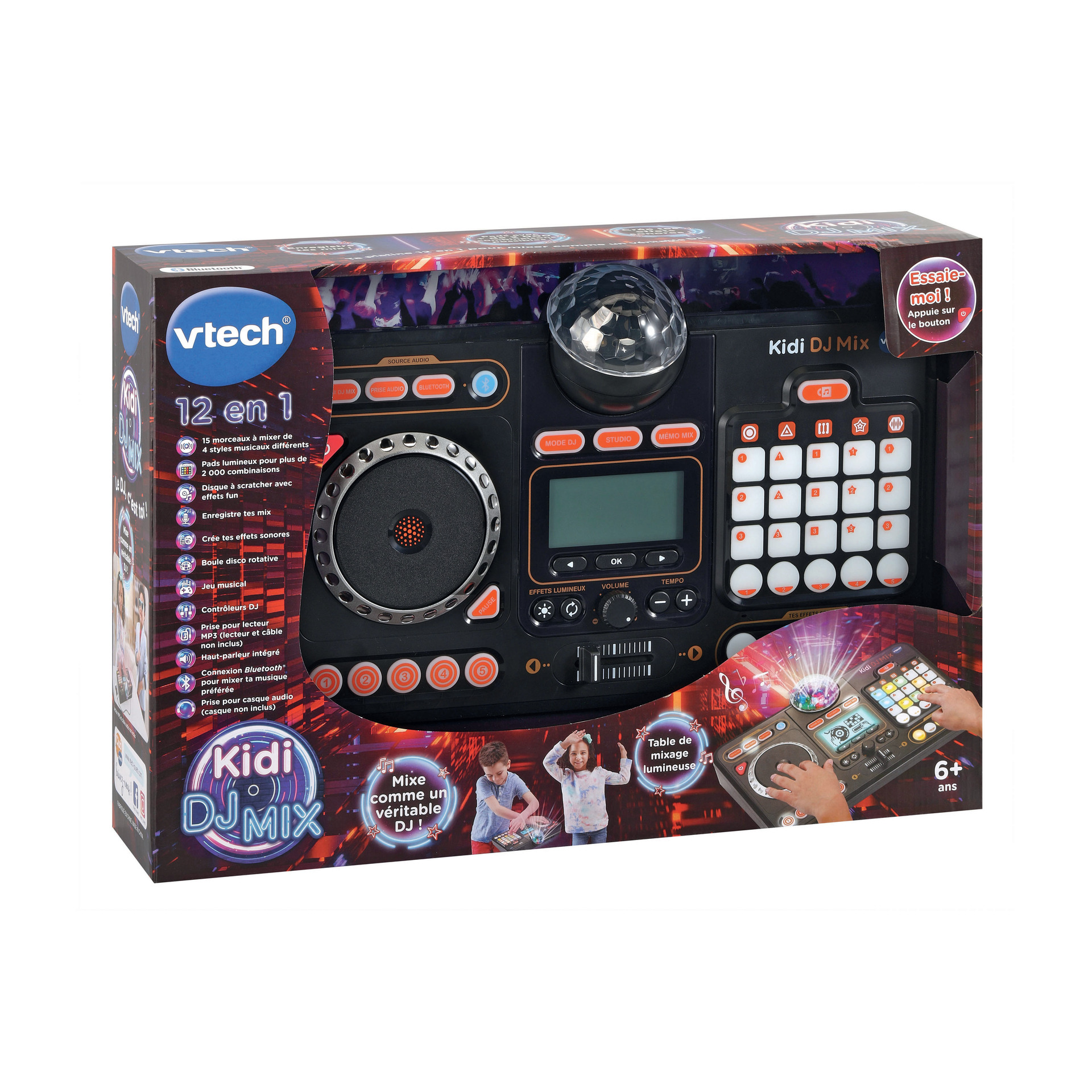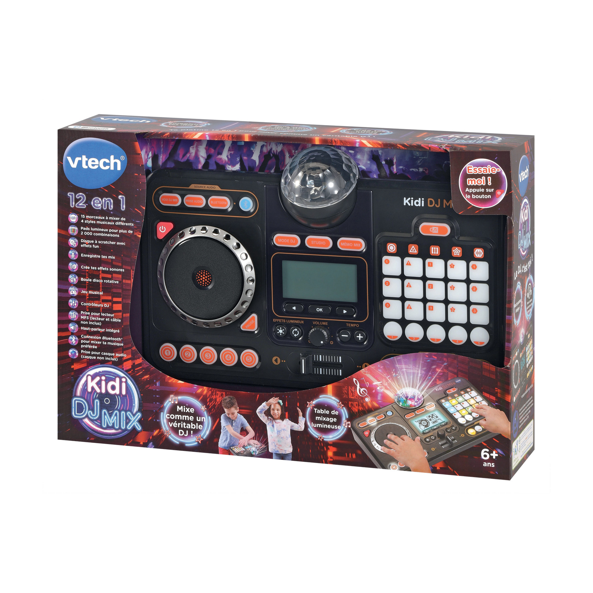 Kidi DJ Mix - 6 ans + Platine fun et intuitive pour faire ses propres enregistrements et mix musicaux. Pads lumineux : + de 2 000 combinaisons possibles ! Micro intégré pour enregistrer des effets sonores. Possibilité d'enregistrer ses créations. Boule disco lumineuse synchronisée avec la musique. Disque à scratcher avec des effets fun. 15 mix DJ inclus dans 4 styles musicaux : hip hop, disco, électro ou pop. Jeux musicaux Branchements Jack pour lecteur MP3 et casque. Connection Bluetooth sécurisée pour intégrer sa propre musique depuis un lecteur MP3 et la mixer Enceinte Arrêt automatique. Boîte try-me Fonctionne avec 4 piles LR6/AA incluses. Compatible avec l’adaptateur secteur VTech (vendu séparement).