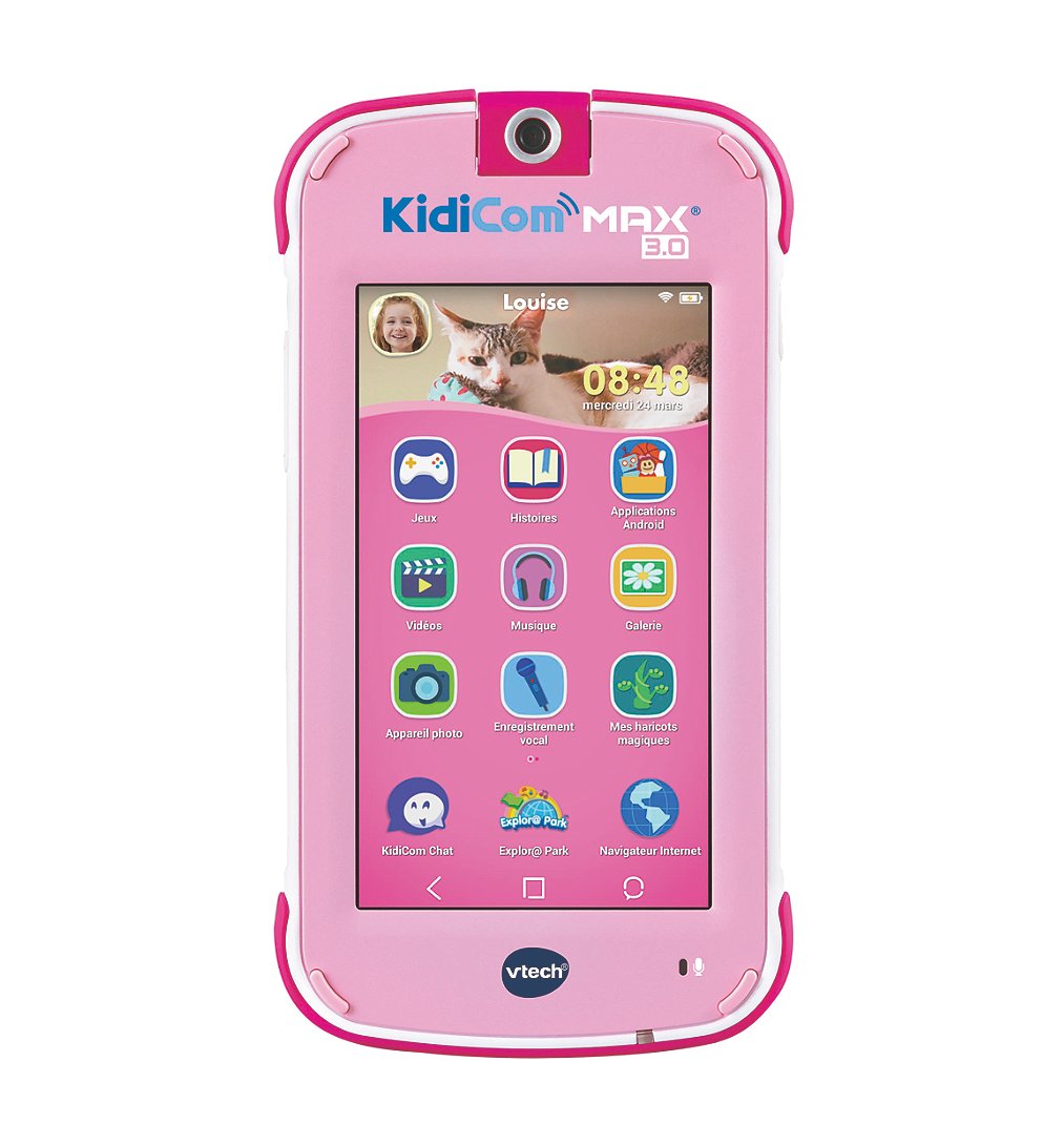 KidiCom MAX 3.0 rose - 3 - 8 ans Un portable encore plus performant avec : - Une nouvelle application KidiCom Chat : l'enfant envoie et reçoit, grâce au Wi-FI, des messages vidéos de 15 secondes sur une interface simplifiée. (Application compatible avec KidiConnect). - Une meilleure résolution de l'écran (1280x720) - Des photos jusqu'à 10 MégaPixels - Un écran multi-touch 5" 16 applications/jeux intégrés (+ 2 à télécharger gratuitement), dont : - Envoi de messages (écrits, dessins, émoticônes) à ses proches via l'application KidiCom Chat - 3 jeux inclus - Appareil photo rotatif avec 50 trucages pour prendre ses amis en photo et faire des selfies - Caméra vidéo - Album photo - Bibliothèque vidéos pour regarder ses vidéos, films ou dessins animés préférés - Lecteur de musique pour emporter sa musique partout - Horloge permettant d'activer des alarmes ou servant de réveil - Téléchargements : avec plus de 2 000 contenus disponibles à télécharger - Gestionnaire de sonneries, bloc notes, calendrier et calculatrice - Processeur Android ultra rapide et navigateur Internet sécurisé pour surfer sur les sites ajoutés par les parents. Mémoire interne de 8 Go et port microSD pour ajouter plus de contenus (mémoire extensible jusqu'à 40 Go). Prise casque et port micro USB. Réglage du contraste. Super robuste grâce à son contour anti-choc et sécurisé ! Avec capteur de mouvement. Batterie intégrée (câble USB-C non inclus). Boîte fenêtre avec rabat. DAS pour la tête : 0.08 W/kg DAS pour le tronc : 0.14 W/kg DAS pour les membres : 0.38 W/kg
