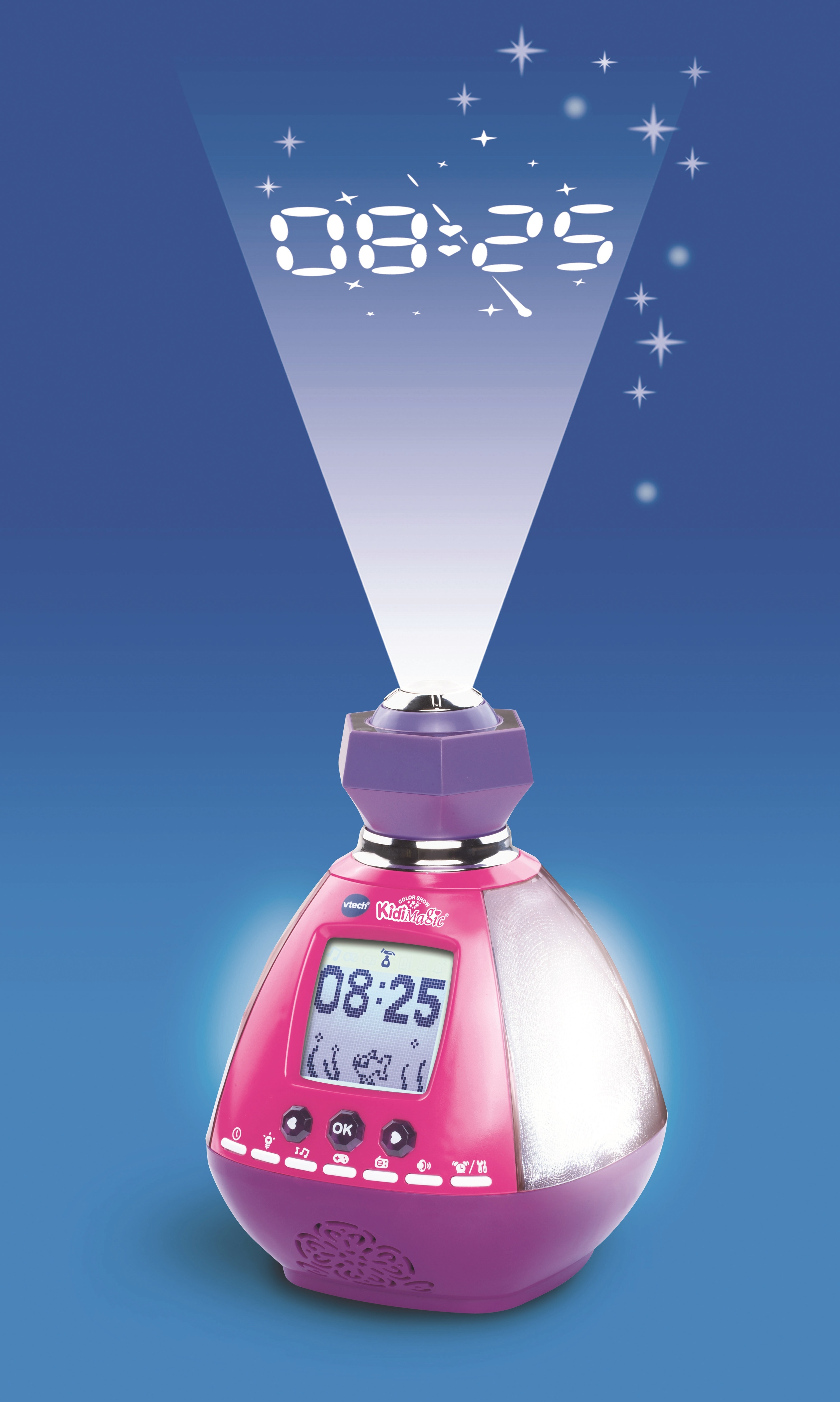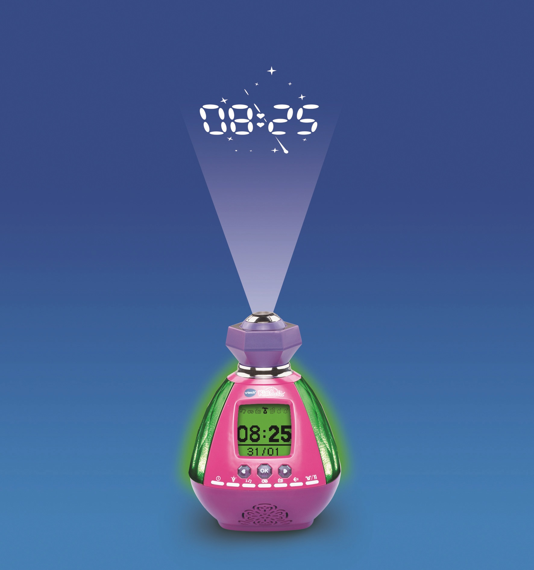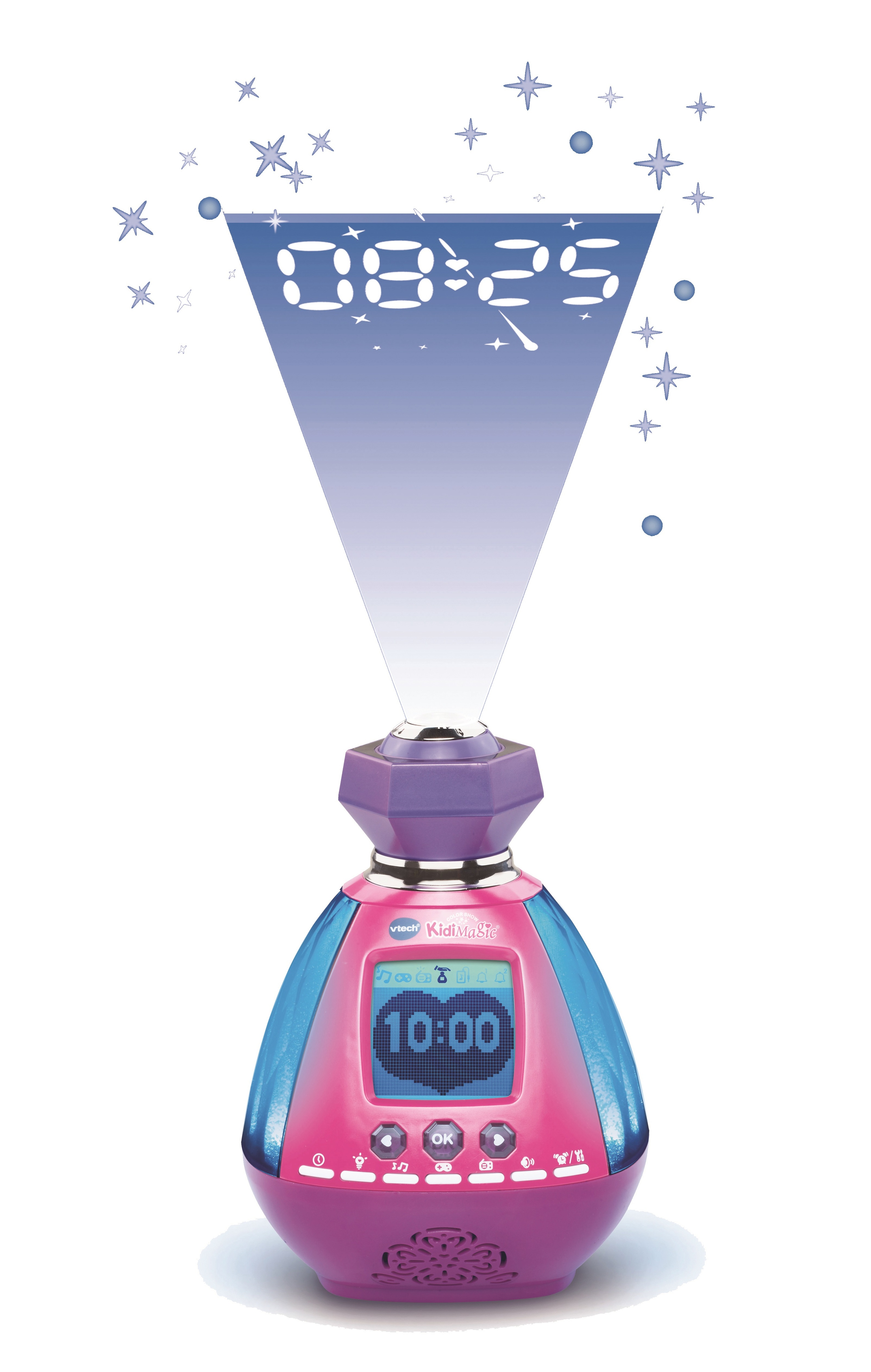 Et toujours : fonctions réveil et horloge parlante, 6 jeux, 5 mélodies relaxantes, radio FM, connexion du lecteur MP3 grâce au câble audio inclus, boule de cristal