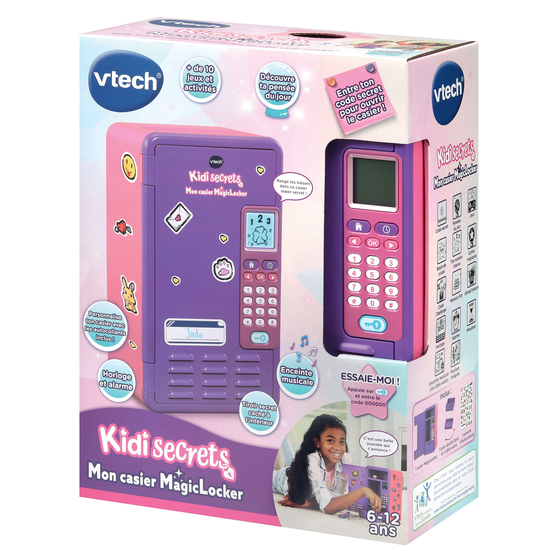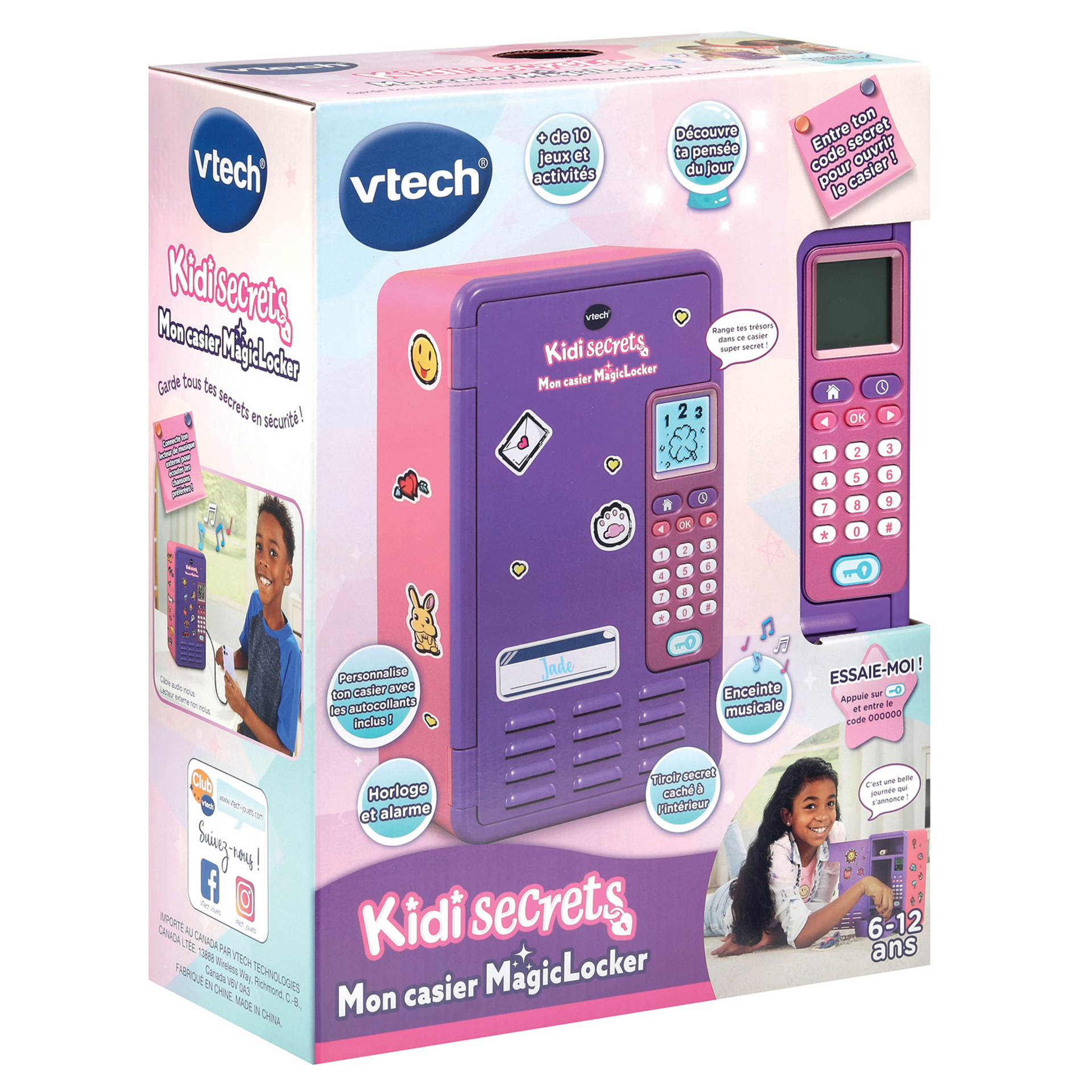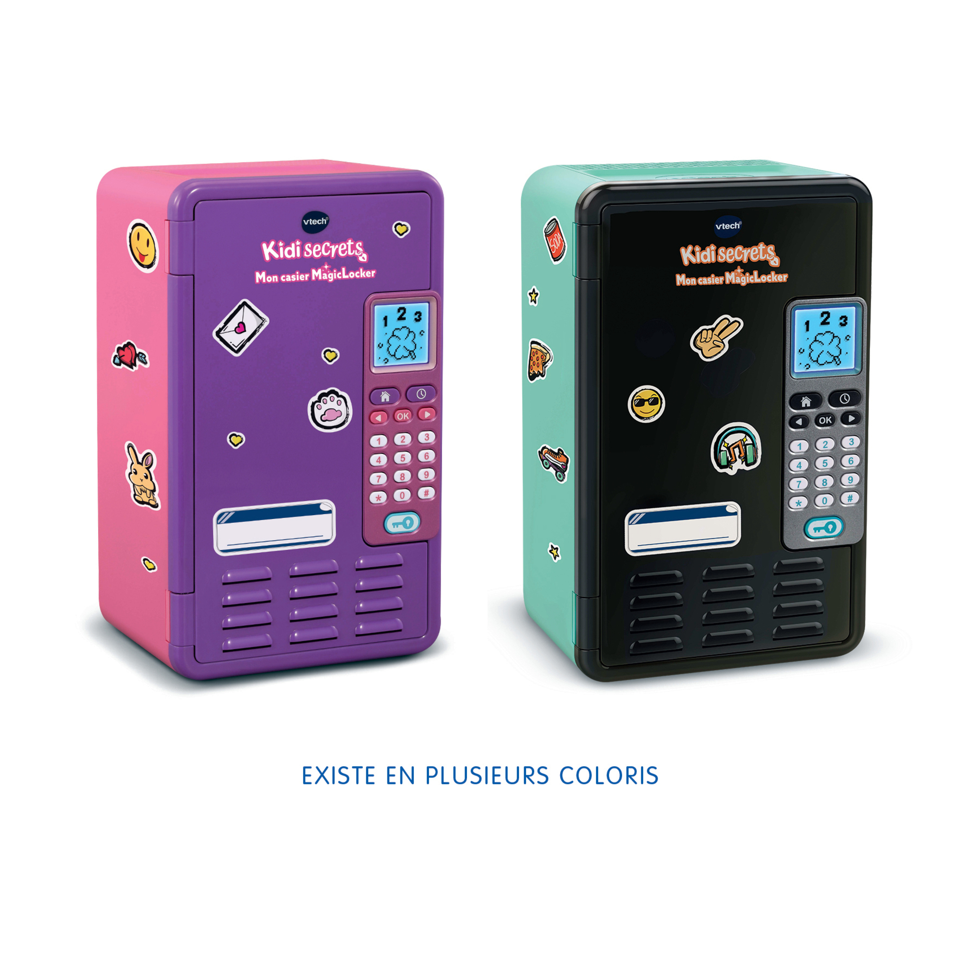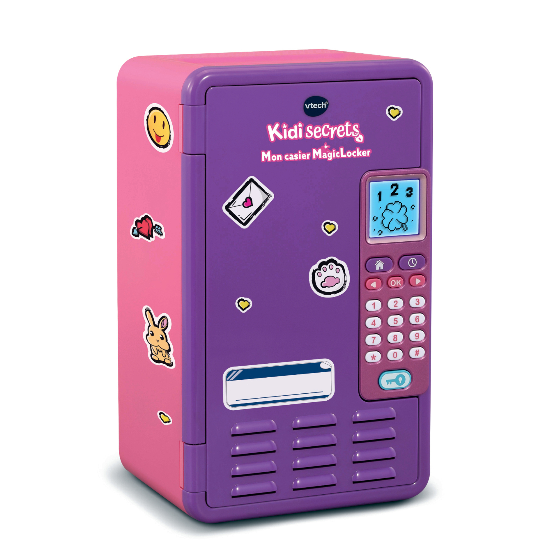 KidiSecrets - Mon casier MagicLocker (rose) - 6 - 12 ans Un casier 100% protégé et personnalisable pour y cacher tous ses secrets comme dans ses séries préférées ! Magique ! Le casier ne s’ouvre d’après avoir entré le code secret qui déverrouillera la porte. A l’intérieur, 2 compartiments dont un secret et 2 tiroirs permettent de cacher bijoux, trésors, petits mots… Sur l’avant, un écran LCD et un clavier à 10 chiffres permettent d’entrer le code secret mais aussi de jouer à des jeux, de s’amuser avec la fonction Horoscope et même d’écouter de la musique. 10 chansons et mélodies incluses et un câble jack pour écouter sa musique depuis un lecteur MP3 (câble inclus). 2 planches de stickers permettent de personnaliser son casier au gré de ses envies, ce qui en fait un objet unique. Fonction alarme et minuterie. Existe en deux coloris : noir/bleu ou rose/violet. Arrêt automatique. Boîte Try-me. Fonctionne avec 3 piles LR03 fournies.