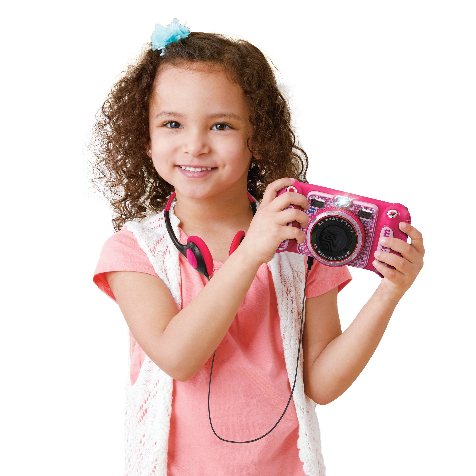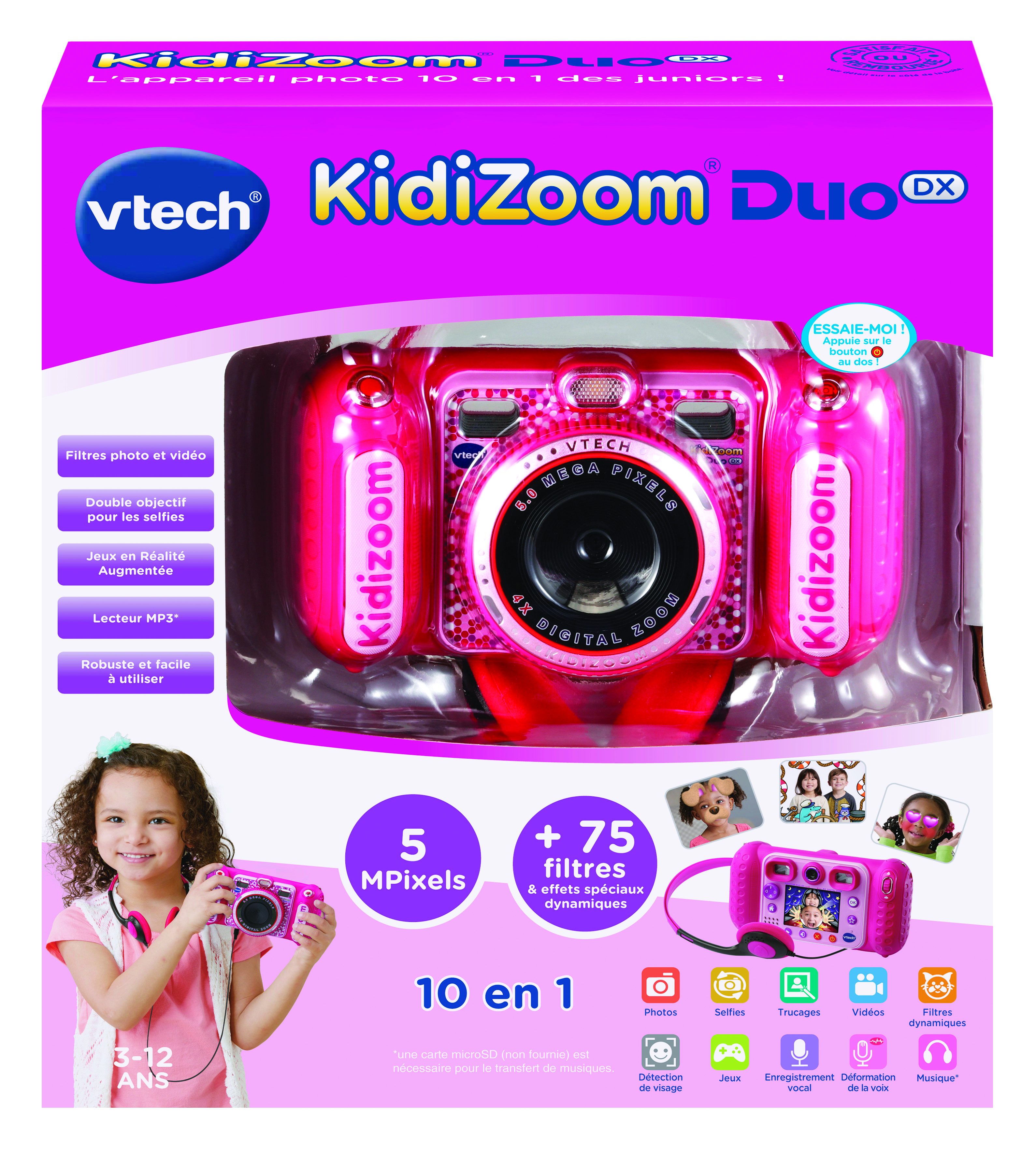 Kidizoom Duo DX rose - 3 - 12 ans Des fonctionnalités innovantes : Plus de 75 filtres dynamiques pour ajouter des effets amusants sur ses photos ! 5 jeux en réalité augmentée pour s'amuser Double objectif, idéal pour prendre des photos avec ses amis ou en mode selfie ! Une résolution à l’avant de 5.0 Méga Pixels et à l'arrière de 2.0 Méga Pixels ! Et toujours : Possibilité d'effectuer des trucages photos & vidéos (+ de 70 cadres, tampons et effets spéciaux) Pour encore plus de fun, possibilité d'enregistrement et de déformation de la voix ! Avec un grand écran couleur 2.4", pratique pour voir ce que l'on filme et revoir ses exploits ! Détection du visage, pour prendre des selfies avec effet retardateur. Analyse des visages : l'appareil photo te dit si la personne prise en photo est drôle ou intelligente ! Photos de groupe : l'enfant photographie plusieurs personnes séparément et ajoute son autoportrait. Secousses délirantes : mode diaporama qui ajoute des effets rigolos à la photo lorsqu'on secoue l'appareil. Bague rotative pour ajouter des filtres de couleur sur les photos ou les vidéos. Fond d'écran personnalisable et contrôle parental pour les jeux. Simple d'utilisation et très résistant : boîtier antichoc avec protection caoutchouc, double viseur, gros bouton déclencheur + dragonne Un lecteur MP3 pour écouter ses musiques préférées avec le casque audio inclus ! Prise USB pour connecter l'appareil à l'ordinateur (câble USB inclus) Mémoire extensible par carte micro SD (non incluse) Fonctionne avec 4 piles AA-LR6