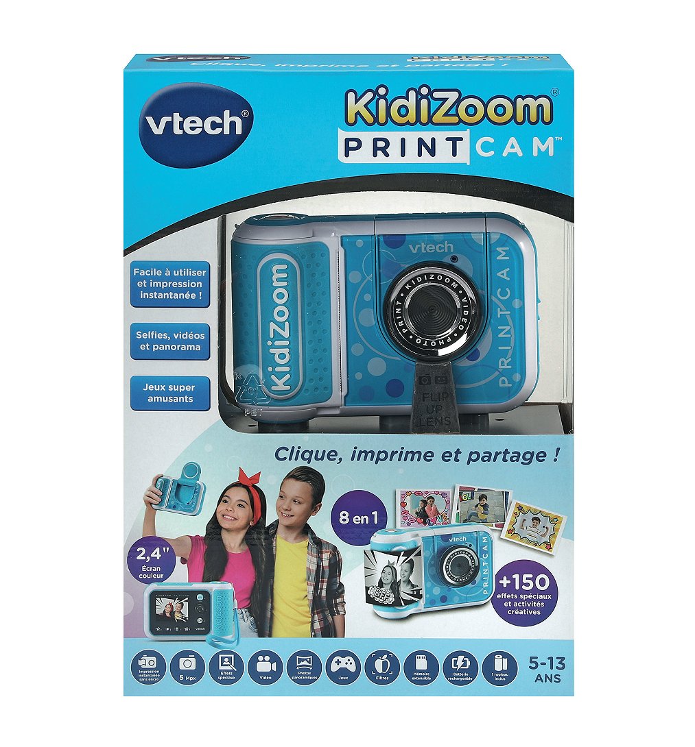KidiZoom Print Cam - 5 - 13 ans Appareil photo & vidéo HD avec mode selfie et détection des visages. Magique ! L'enfant imprime directement ses photos ! + de 40 effets spéciaux et 60 cadres et tampons pour personnaliser ses photos. Différents formats d’impression : photos classiques, panoramas, coloriages, cartes, étiquettes, BD. 1 rouleau de papier pour impression inclus permettant de réaliser jusqu’à 80 tirages. Contrôle parentaux pour limiter le nombre d’impression par jour. Impression thermique. 3 jeux et des activités créatives. Résolution 5.0 M pixels Mémoire : 256 MB - Extension de la mémoire avec carte micro SD (non fournie) Dragonne et câble USB fournis. Existe en deux coloris : rouge et bleu. Arrêt automatique. Boîte fermée. Batterie rechargeable.