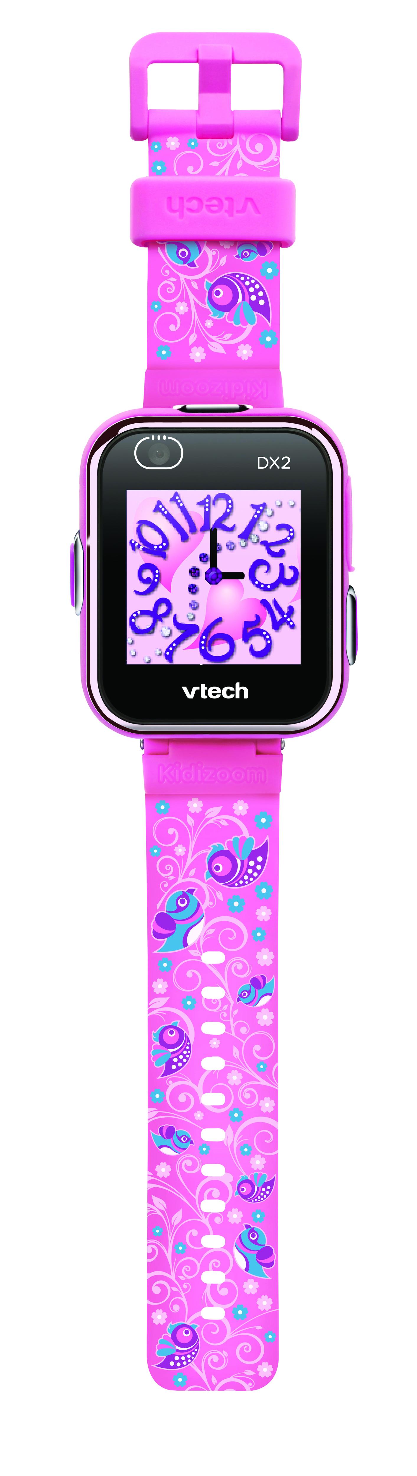 Kidizoom Smart Watch DX2 rose – 5 - 13 ans Nouveau ! Le design change pour un écran plus fin toujours plus high-tech. Un double objectif avec caméra frontale permet désormais de prendre des photos et d’enregistrer des vidéos en selfie ! Grâce au capteur intégré, la montre suit l’enfant dans tous ses mouvements. 3 défis sport pour s’amuser en sautant, en dansant ou en courant. Et toujours : écran tactile couleur, double affichage de l'heure : numérique ou analogique, appareil photo et caméra vidéo, écran personnalisable avec effets 3D, trucages, cadres et ajout de filtres de couleur, 8 jeux et activités inclus dont un jeu avec détection de couleurs, fonction réveil/alarme, enregistrement et déformation de la voix, détecteur de visage pour des effets rigolos, chronomètre, sablier, calendrier et calculatrice. La montre se connecte à l'Explor@ Park pour télécharger des applis, des jeux et des trucages photo supplémentaires. Elle se connecte également à l’ordinateur pour transférer les fichiers audio, photo et vidéo ainsi que pour recharger la batterie. Mémoire interne de 256 Mo pour enregistrer jusqu’à 1600 photos ou 23 min de vidéo. Autonomie de la batterie : 2 à 3 jours en utilisation classique et jusqu’à 2 semaines en utilisation réduite. Montre solide, résistante aux chocs et aux éclaboussures (ne pas immerger). Contrôle parental pour délimiter le temps de jeu. Boîte cristal. Batterie rechargeable par USB. (câble micro-USB inclus).
