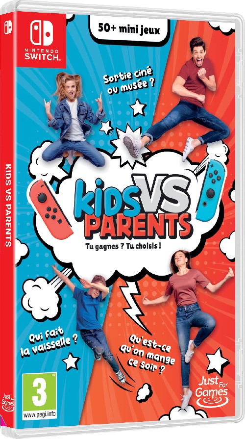 Kids Vs Parents est un jeu familial au design cartoon qui va amener du piquant dans le quotidien de votre maison ! La vaisselle à faire, le chien à sortir, les chambres à ranger... Toujours des corvées, mais personne pour s'en occuper... Kids VS Parents est LE jeu qui décidera pour vous qui s'y collera ! Affrontez-vous en famille : Parents contre enfants, et que le meilleur gagne ! Pour les parents, pas d'inquiétude ! Les contrôles des jeux sont très simples et utilisent souvent le motion-control : secouez, visez, tournez les Joy-Con de votre Nintendo Switch pour remporter la partie ! Joueur expérimenté ou non, chacun a ses chances de remporter la partie ! 50 mini-jeux vous attendent, dans quatre modes différents : Maison des Rêves : Grimpez les étages de la maison des rêves pour obtenir la plus belle des chambres et profiter d'une super sieste ! Les mini jeux s'enchaînent les uns après les autres, l'équipe qui remporte le mini-jeu monte d'un étage.