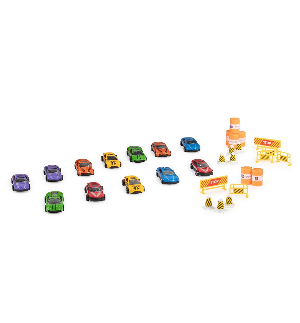 | La boîte contient | 1 camion avec à l’intérieur : 12 véhicules, 6 barils d'huile, 2 panneaux Stop, 4 barrières, 7 cônes. |
