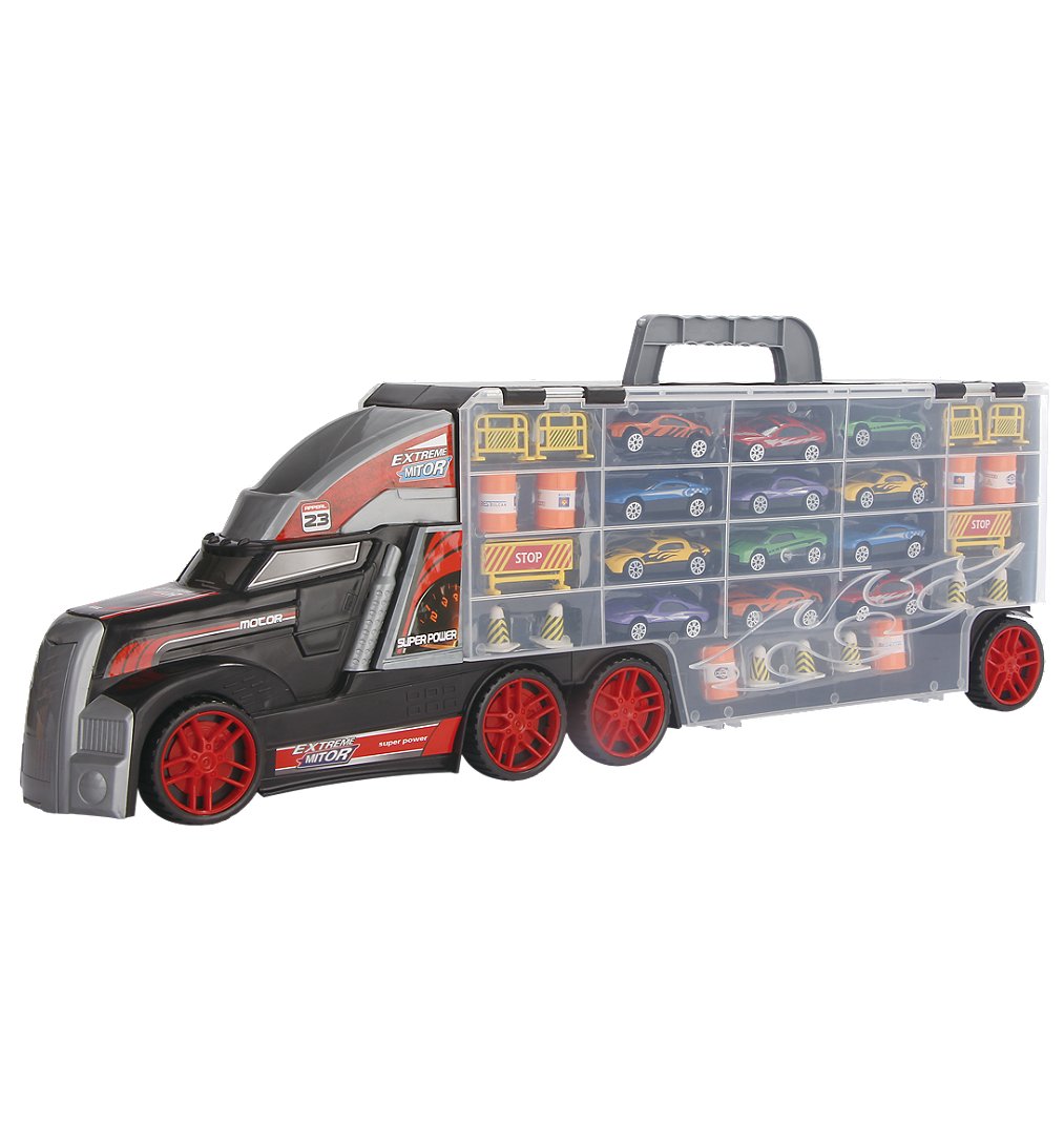 • Ce grand camion est équipé de 12 véhicules en métal à l'échelle 1/64, tous dotés de roues libres pour des courses effrénées.