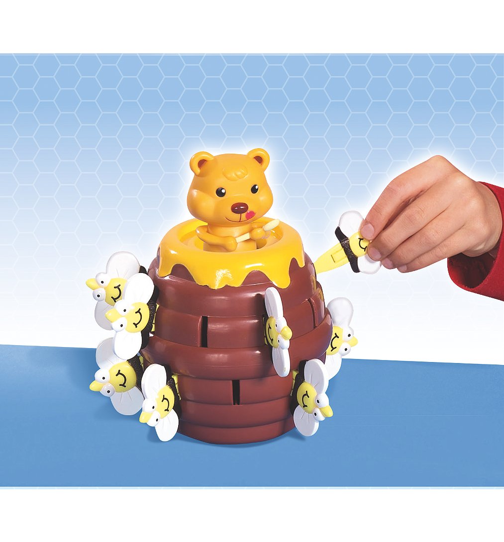 • Le but du jeu est de veiller à ce que l'ourson reste bien assis dans la ruche. Chaque abeille doit être glissée dans la bonne fente pour éviter que l'ourson ne saute et ne mette fin à la partie.