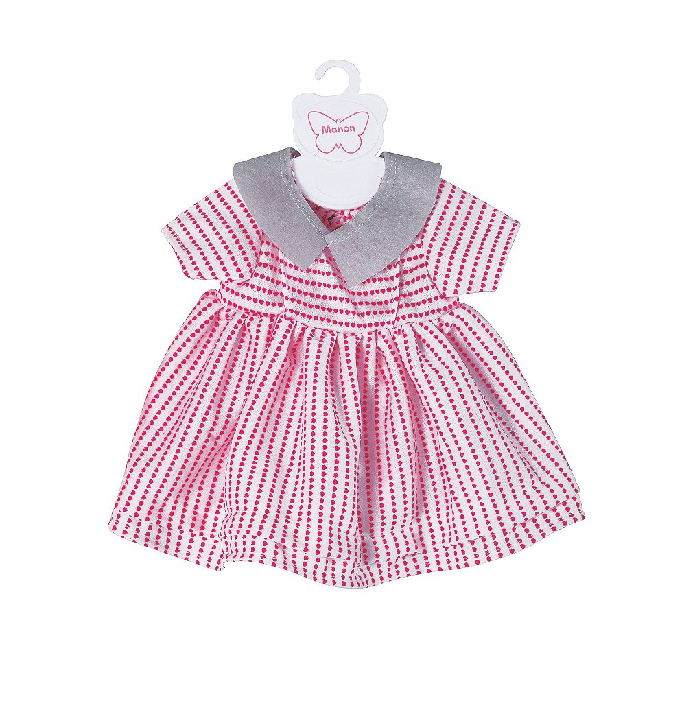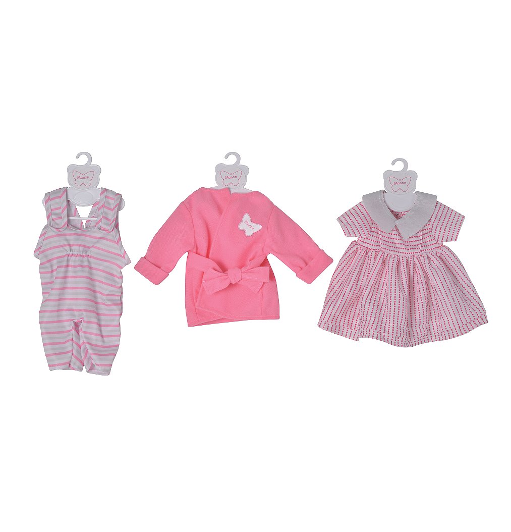 • Le dressing de Manon comprend un pyjama doux et confortable, trois ensembles de tenues pour diverses occasions (dont un body et deux jolies robes), ainsi que de belles sandales pour être habillée de la tête aux pieds.