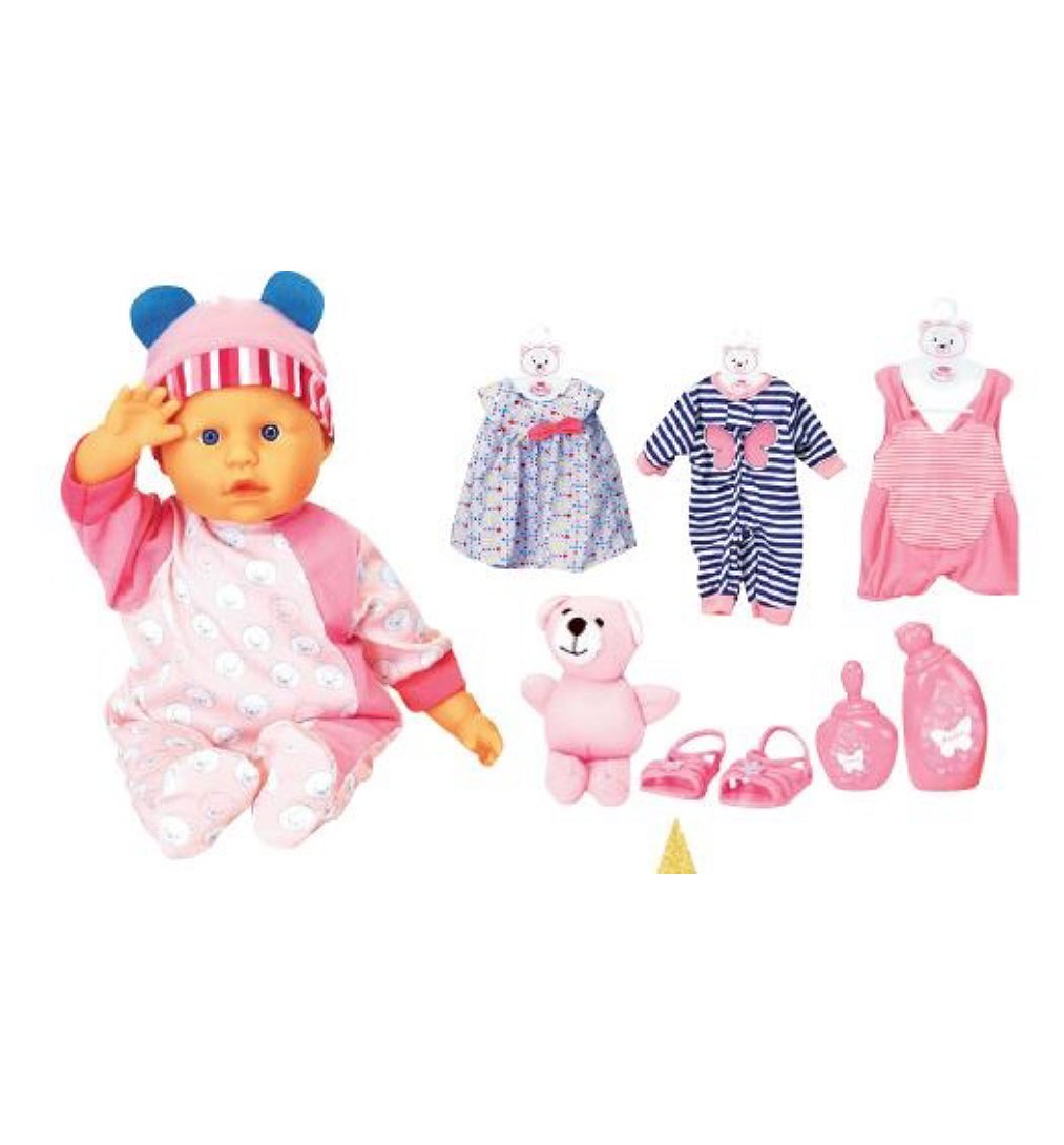| La boîte contient | 1 poupée de 40 cm, 4 tenues, 1 ourson, 1 paire de chaussures et 2 flacons. |