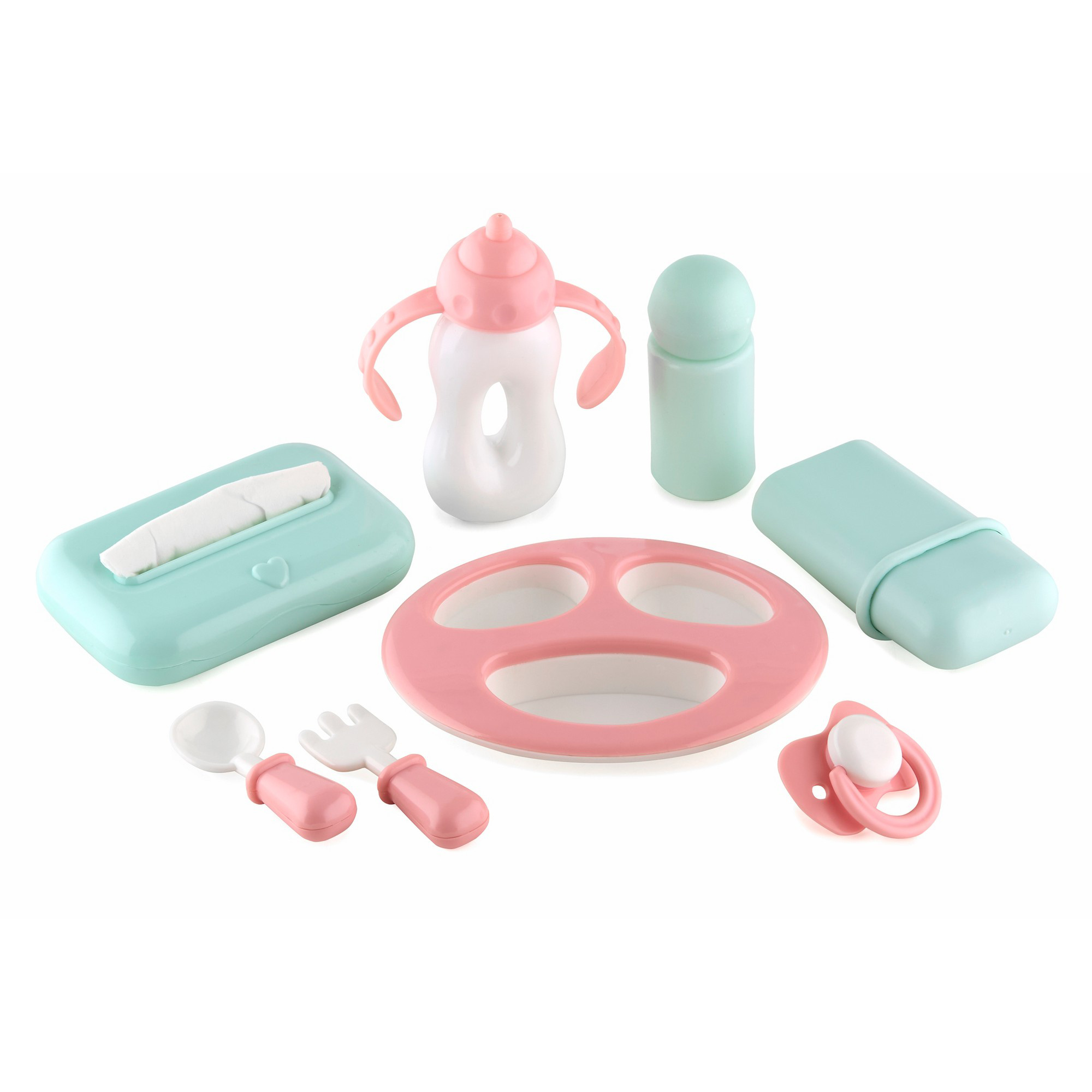 • L'ensemble comprend une panoplie complète de 8 accessoires pour recréer le rituel du repas, y compris une gourde, une tétine, un bavoir, un pot, une assiette et des couverts, le tout présenté dans une jolie trousse de transport.