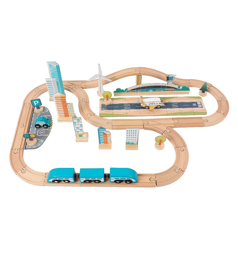 • Le set comprend un train en bois composé de trois wagons aimantés entre eux, 24 rails universels faciles à assembler, ainsi qu'une voiture de police et un avion pour encore plus d’histoires. Votre enfant pourra faire circuler le train, veiller à la sécurité avec la voiture de police, et même s’envoler vers de nouveaux horizons avec l'avion !