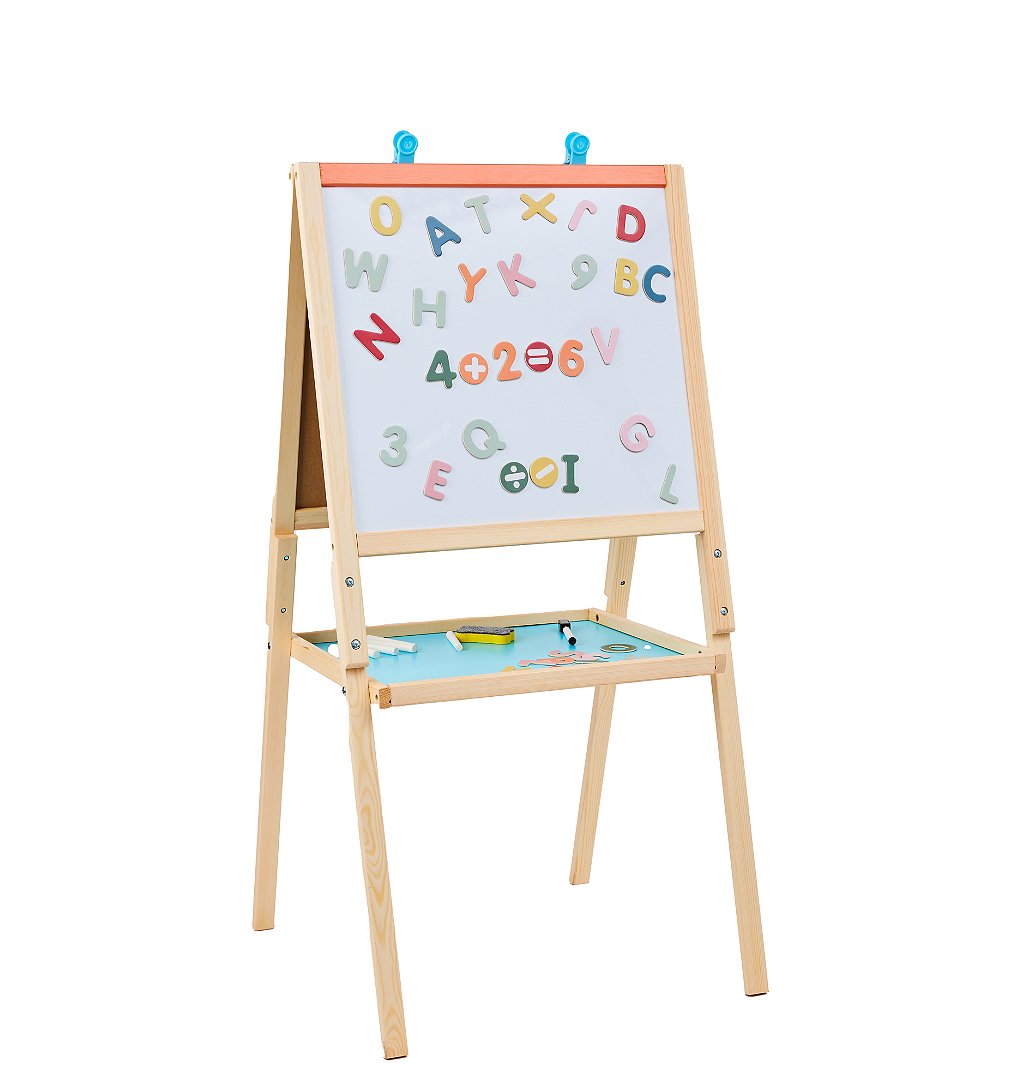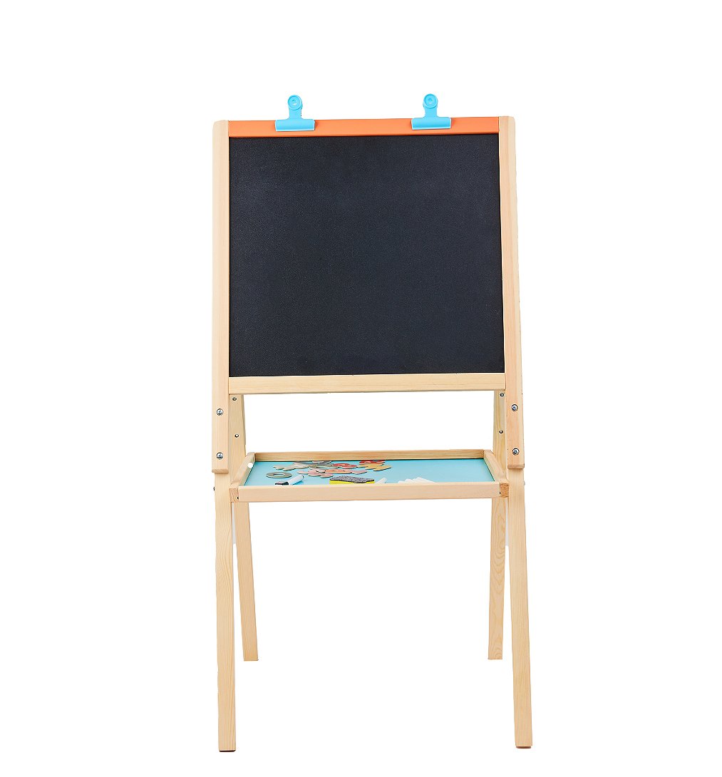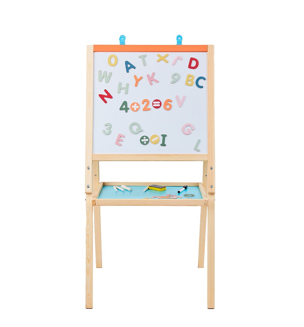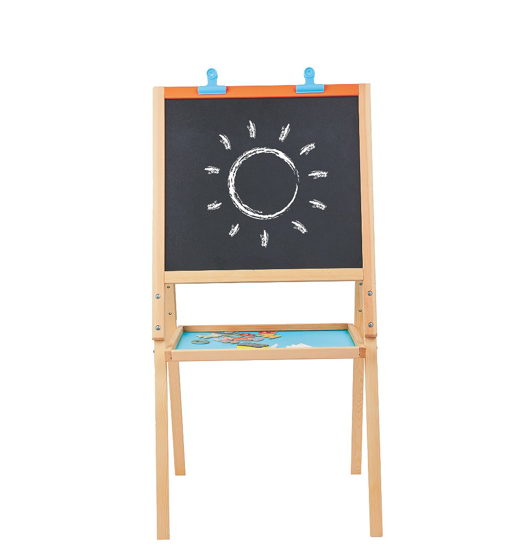 Offrez à votre enfant un espace ludique pour s’épanouir artistiquement avec ce tableau en bois double face. À partir de 3 ans.